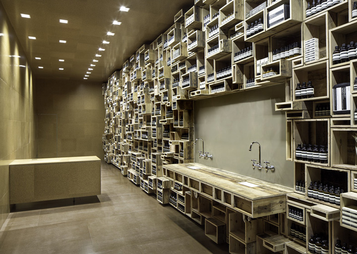 Sklep z kosmetykami marki AESOP urzekł mnie swoją prostotą i bardzo nietypową aranżacją. Niewątpliwie mamy tutaj do czynienia z oryginalnym ciekawym pomysłem.Architekci z firmy projektowej NADAA wzięli inspiracje z XX-wiecznych aptek,jednakże przełamali konwencję zastosowując nietypową formę przestrzennych kubików oraz łącząc stare deski z eleganckimi , estetycznymi materiałami.Do tego zupełnie minimalistycznie i nietypowo została rozwiązana kwestia kasy ,która ogranicza się do prostej formy kubika.