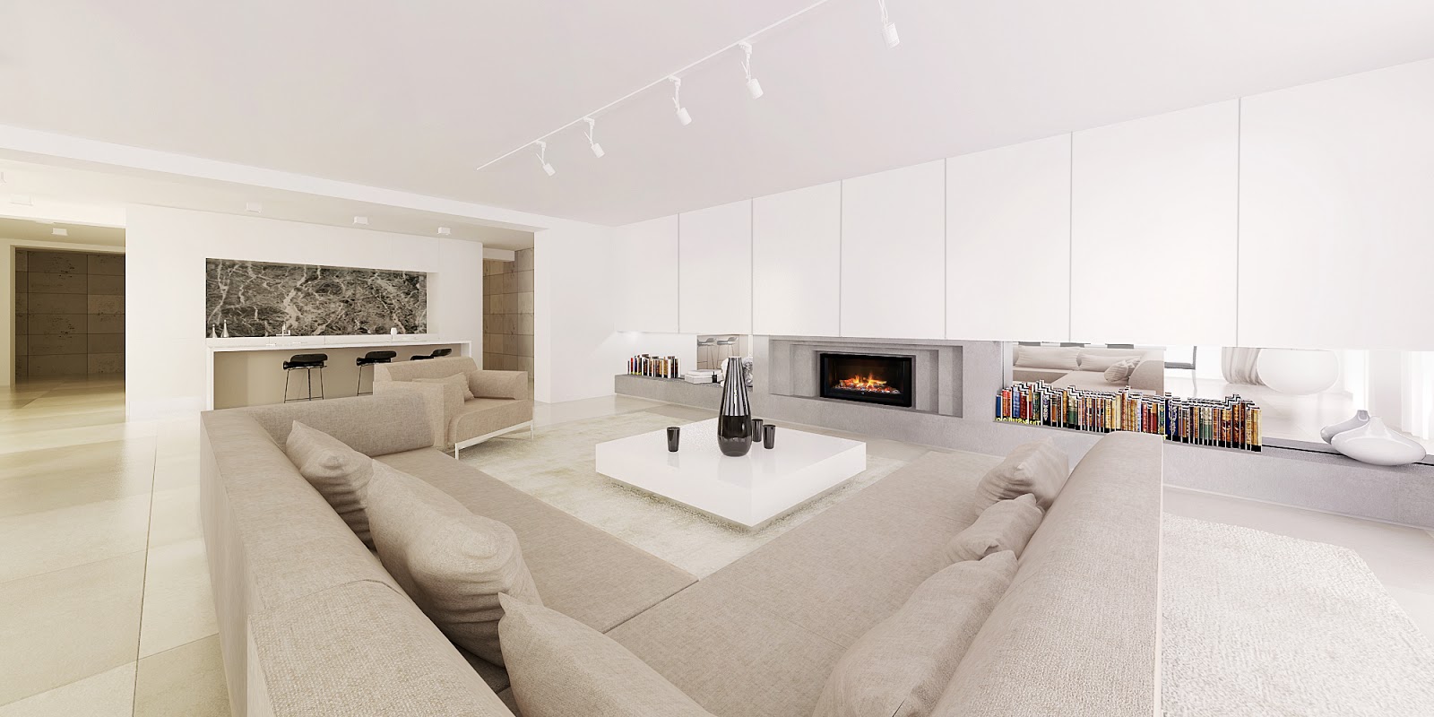 Tym razem chciałam przedstawić na blogu najnowszy projekt – dom jednorodzinny w Żukowie o powierzchni 200 m2. Dom jest 2 piętrowy z użytkowym poddaszem ,przeznaczonym na pomieszczenia dla gości.Na wszystkich piętrach położone ma zostać ogrzewanie podłogowe , dlatego zdecydowaliśmy się na zastosowanie płytek firmy Gigacer o dużym rozmiarze 120×120 cm ,w kolorze jasno – beżowym z fugą milimetrową , dzięki czemu na tak dużej powierzchni uzyskamy wrażenie jednej płaszczyzny z lekkim połyskiem.Wszystkie pomieszczenia miały być w ciepłej tonacji , nowoczesne i eleganckie.Na parterze znajduje się duży salon z kominkiem i stołem jadalnianym , kuchnia i łazienka.Nad kominkiem w salonie znajdują się szafki ścienne z frontami wykonanymi z mdf’u (lakierowane na wys.połysk) ,a za frontami znajduje się dodatkowo telewizor ,fronty szafek rozsuwają się elektronicznie.Całość domyka kuchnia z dużą wyspą.
