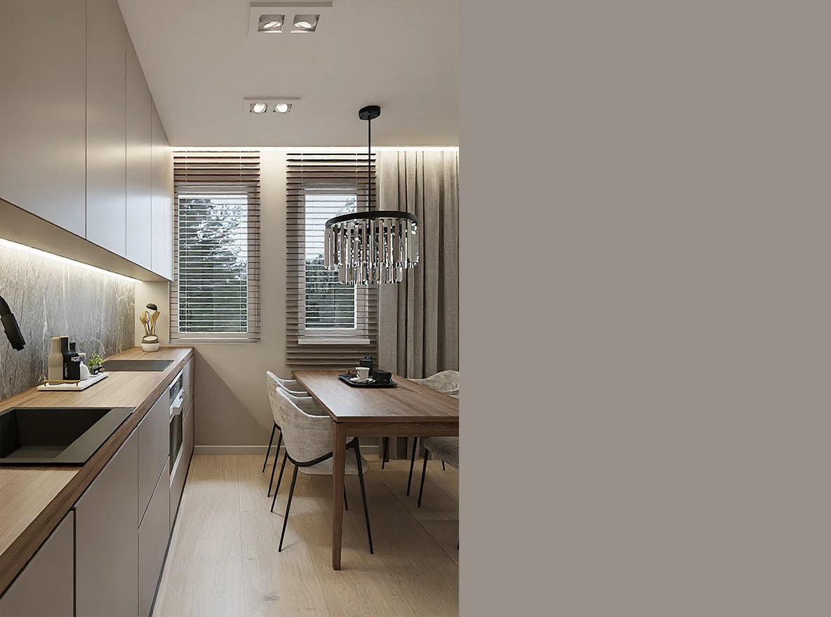 The intricate molding adorning the walls gives the residents a sense of luxury and exclusivity, emphasizing the interior's elegance. The kitchen, in subdued tones, captivates with its earthy-beige cabinet fronts and composite stone countertops, creating an elegant and functional space for cooking and spending time. A large beige sofa in the living room, complemented by molding and illuminated paintings, ensures a comfortable and stylish retreat, creating the perfect relaxation zone. Floor-mounted black sconces illuminating elegant graphics create a pleasant atmosphere and add character to the interior, inviting you to spend time in this spacious living room. The television placed on the wall with slats and LED strip adds modernity to the living room, creating an ideal place to watch favorite shows and movies. The bar with floor-to-ceiling glass doors with smoked glass adds elegance and functionality, serving as an excellent space for gatherings with friends and family. A crystal chandelier above the table adds luxury and class, emphasizing the unique character of the interior and creating an elegant atmosphere during shared meals. The molding on the corridor walls, along with floor lighting, visually enlarges the space, introducing pleasant lighting into the apartment and adding elegance.