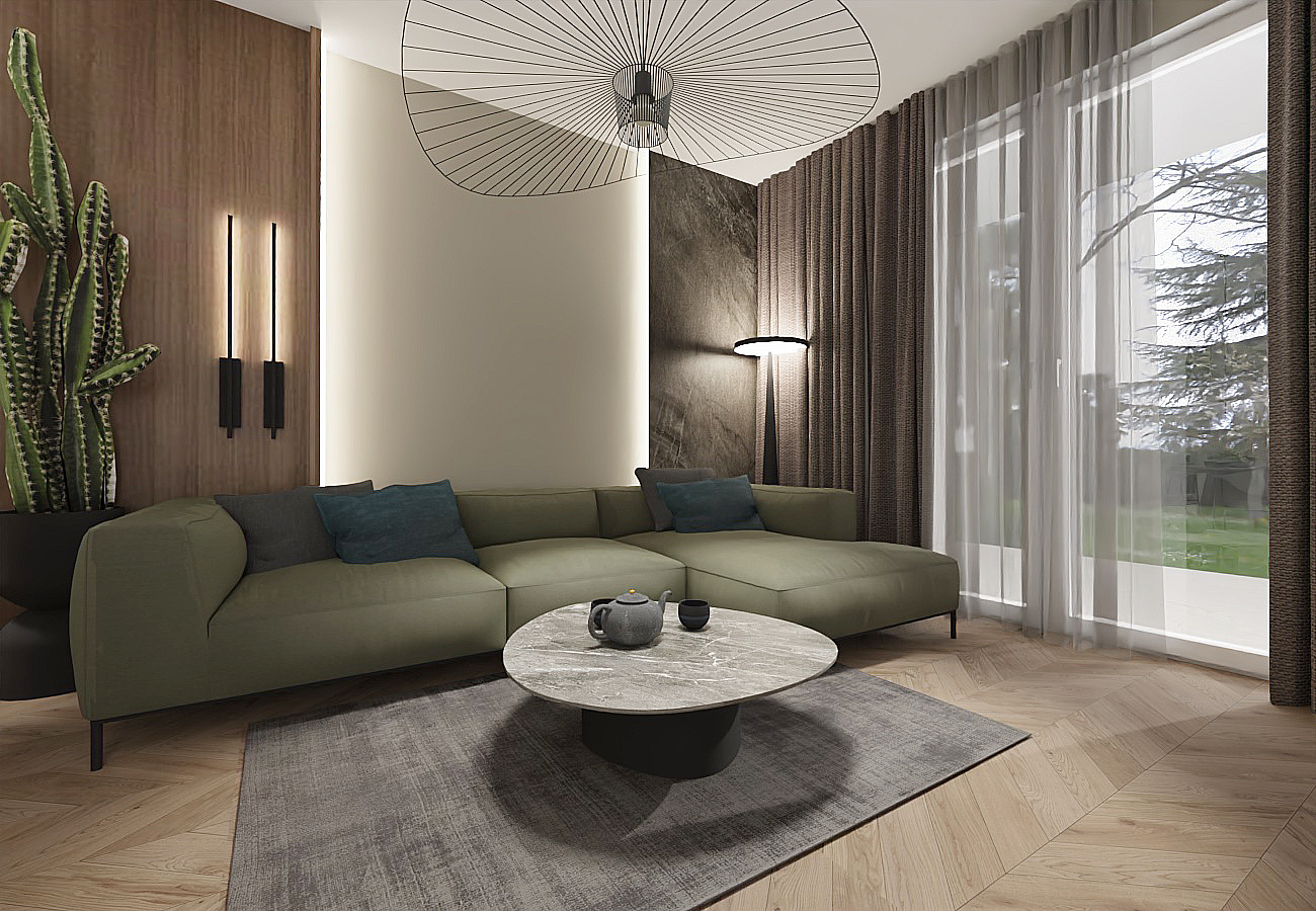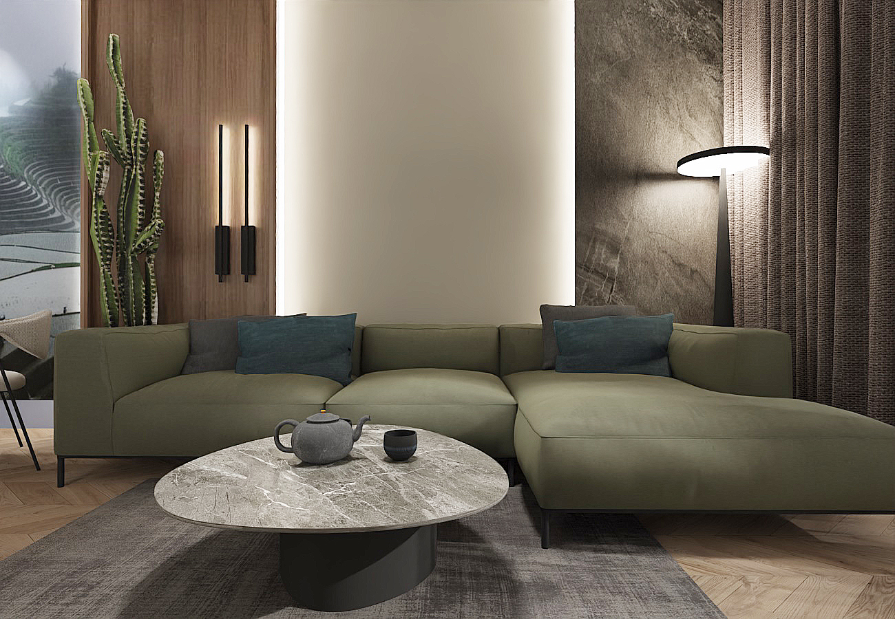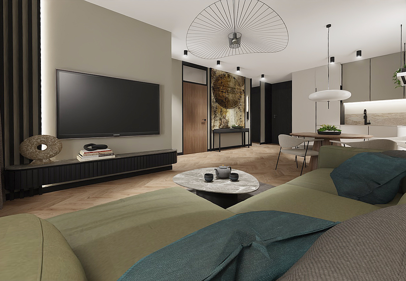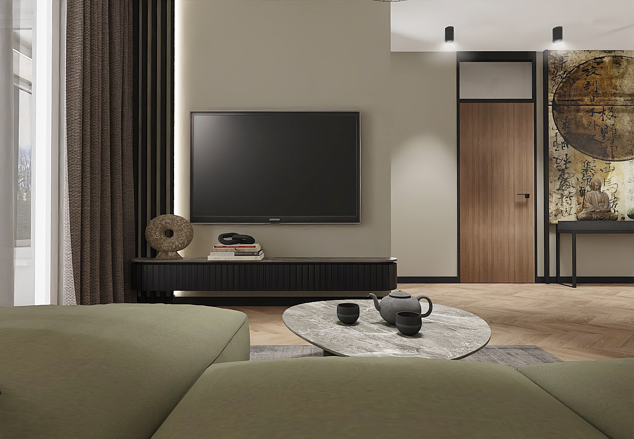 The apartment features a muted green color palette that evokes the images of rice fields emerging from the morning mist and lush jungles. The clients specifically wanted this view to be incorporated on the wall, framed by wooden panels near the dining table.An additional travel memento is the painting located in the hallway above the dresser. The black decorative strips on the wall reference the wooden architecture of Vietnam, creating a cohesive composition that delineates the mirror in the foyer and the space for the console.The tall vertical divisions are mirrored in the door design, which has been raised to the ceiling and framed in black, allowing natural light to flow into the bathroom through the glass top, adding originality to the space. The geometric lines formed by the black accents contrast beautifully with the softer shapes of the hanging lamps, dining table, chairs, coffee table, and even the RTV cabinet with its gently rounded edges.In the cozy corner of the living room, a spacious sofa in a muted green hue takes center stage, inviting relaxation in harmony with the surrounding colors.