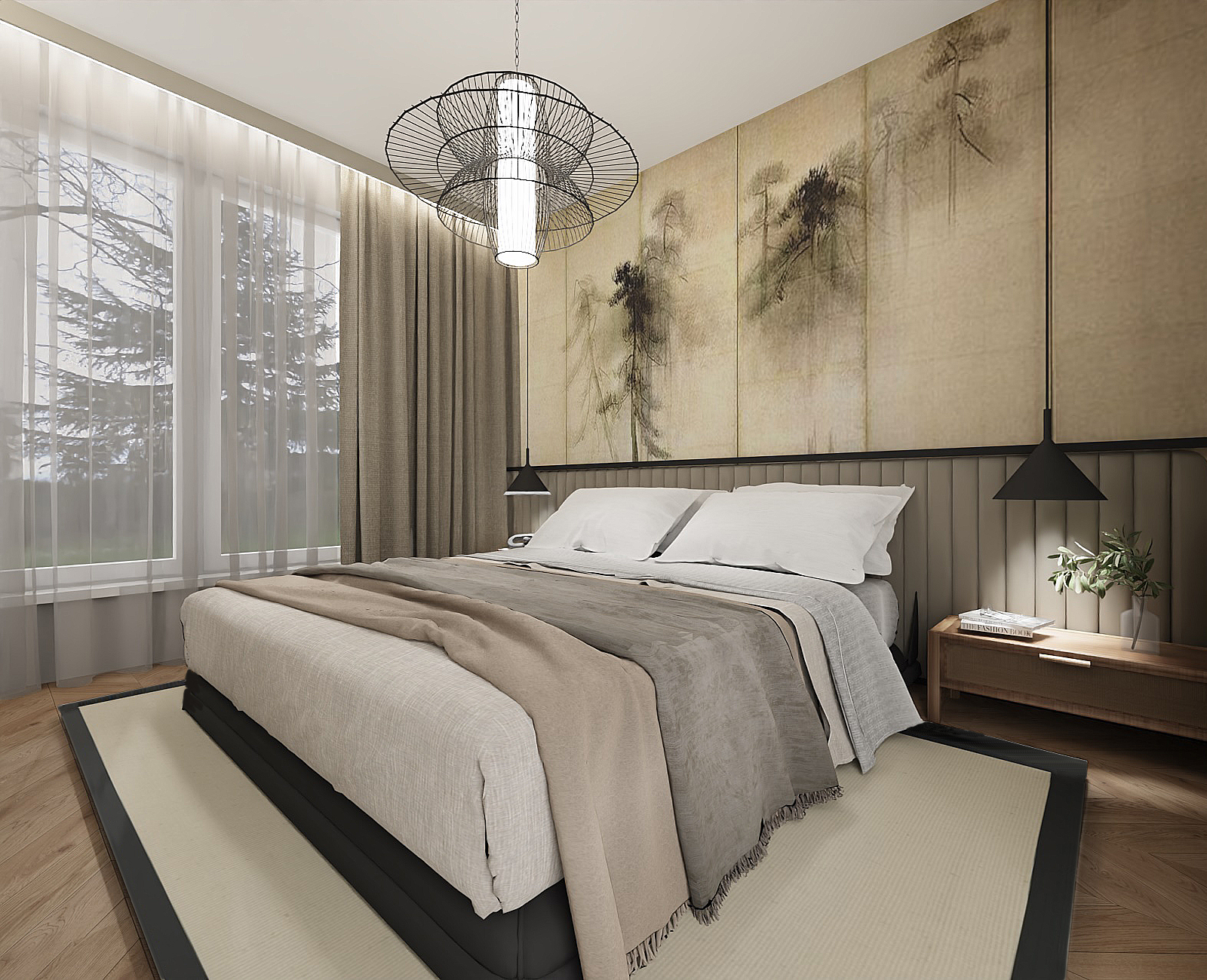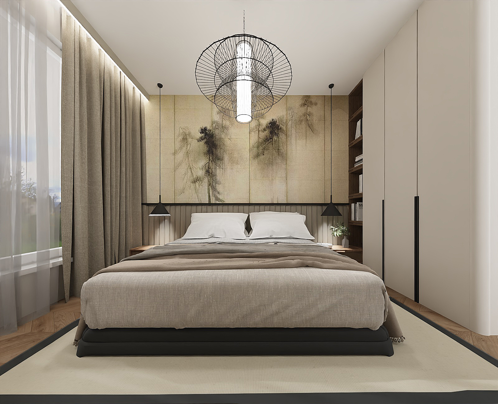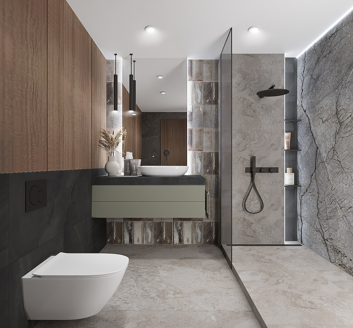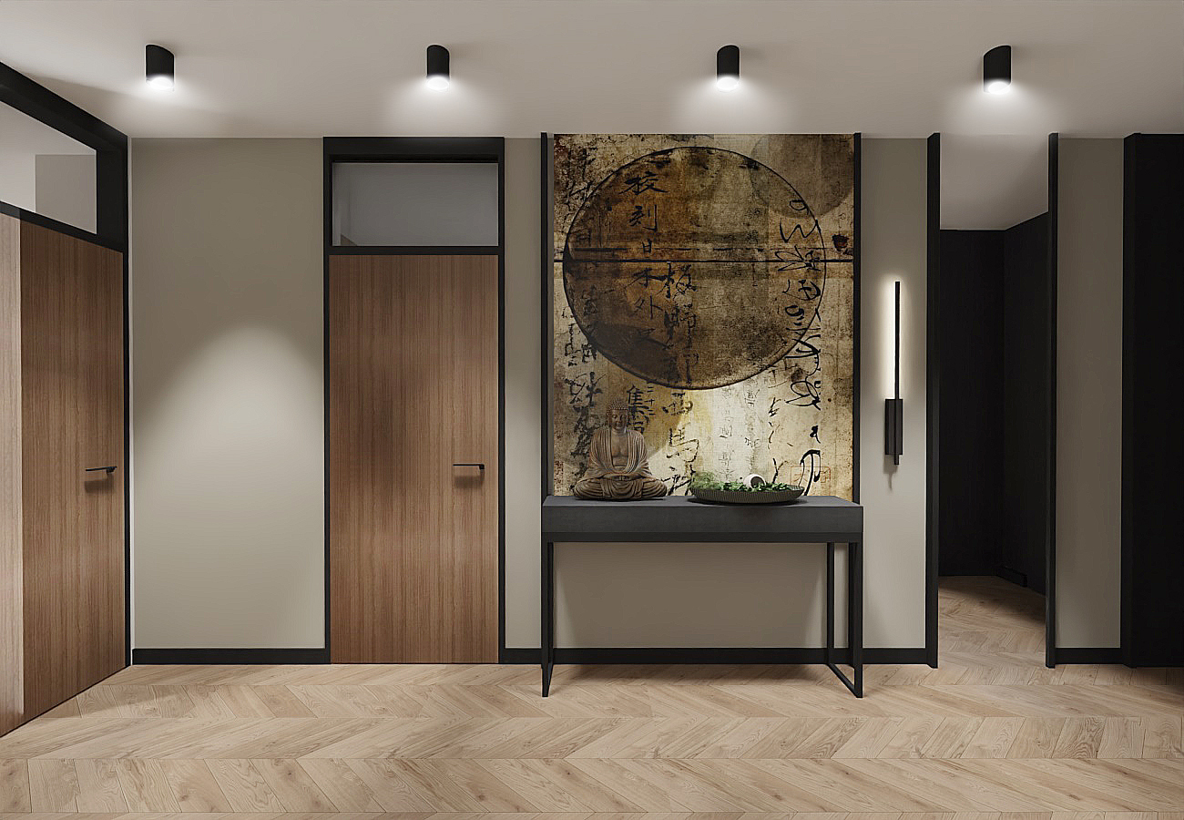 The warmth of the bedroom radiates throughout the space, harmoniously complementing the living area. The highlight is the wallpaper above the bed, inspired by Japanese art. A wide upholstered headboard, separated from the wallpaper by a sleek black trim, adds softness and ties in with other black elements in the room, such as the lamps, door frames, and bed. The tall cabinetry includes convenient access to books from the bedside, ensuring functionality and style. Completing the look is a spacious rug in the style of Japanese minimalism. The bathroom exudes a relaxing atmosphere, drawing inspiration from nature's various shades. Tiles range from the darkest stone to a more natural sandy tone, and the same dark stone forms the countertop on the vanity, creating a cohesive design. A hanging cabinet in an aloe green hue contrasts beautifully with the dark tiles. Additional storage is provided by a softly lit niche in the shower, featuring shelves for cosmetics. Matte black faucets enhance the aesthetic, also appearing in the kitchen along with matching handles, creating a tidy and tranquil space—perfect for relaxation and unwinding. AREA: PRZYLESIE, SOPOT