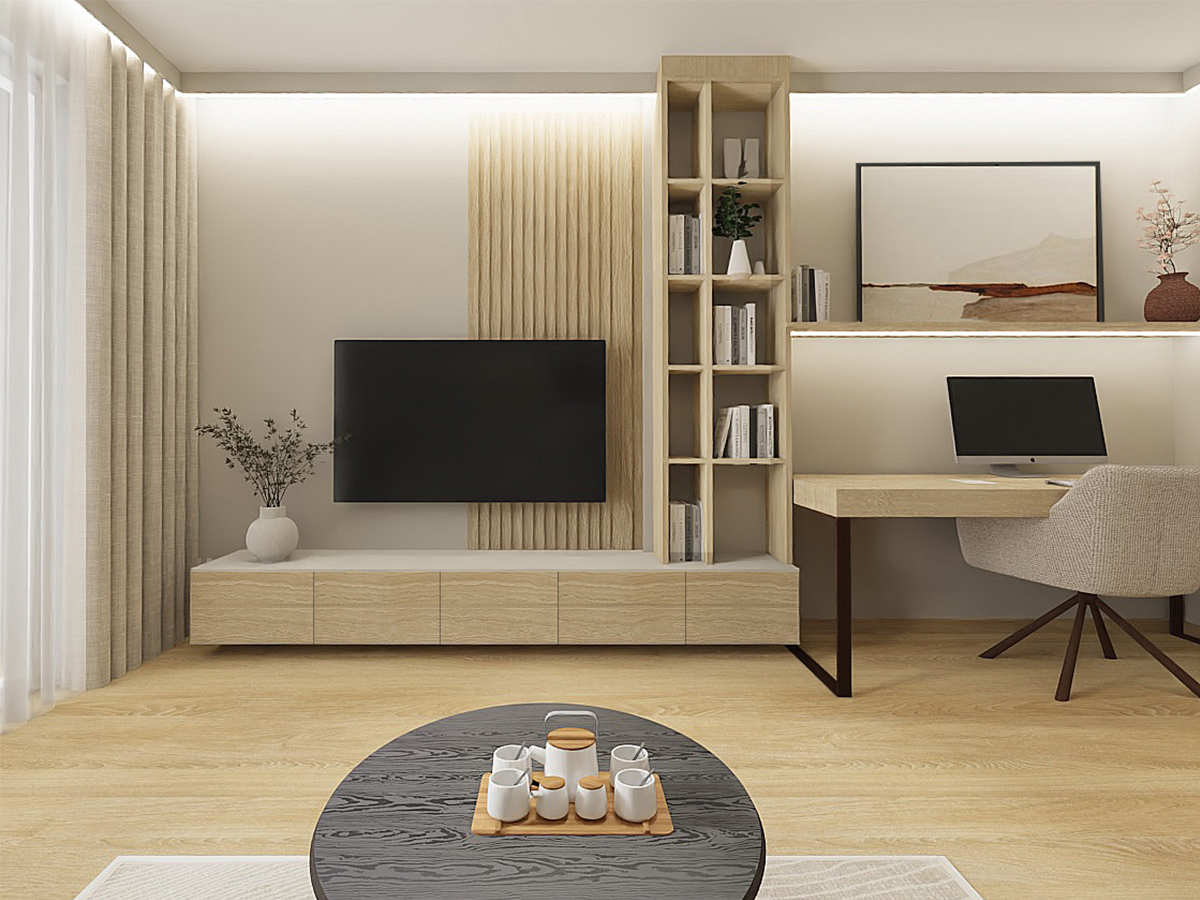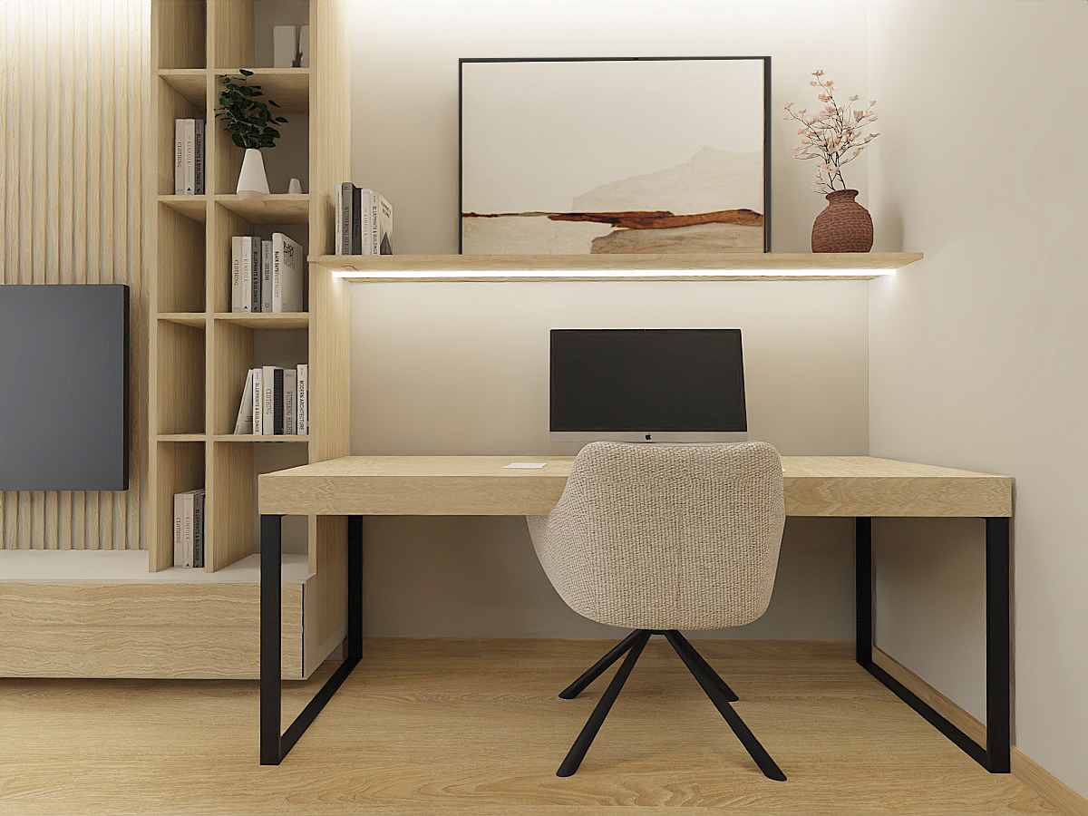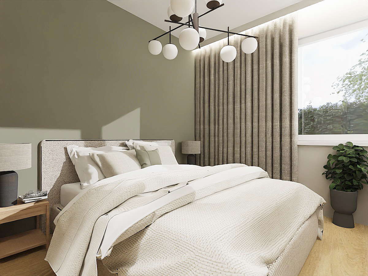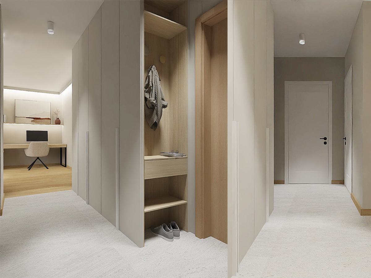 This layout perfectly meets the needs of someone working from home, providing a comfortable space for both work and relaxation. The kitchen, separate from the rest of the apartment, exudes tranquility with its use of light beige fronts and countertop, as well as wooden lower cabinets. This choice of colors and materials, including floor tiles, creates a harmonious space that is both functional and aesthetically pleasing. As the kitchen is open to the hallway, it was important for me to ensure that its color scheme is consistent with the rest of the living area.In the bedroom, I opted for a green accent wall, which research shows is most beneficial for calming and relaxation, while the remaining walls and high cabinetry in beige tones maintain consistency with the rest of the apartment. This creates an ideal retreat for unwinding after a long day. In the hallway, I designed a large storage unit with practical storage solutions in mind. The spacious wardrobe accommodates jackets and includes an organizational section as well as a niche with a shelf for keys. The flooring in the hallway and part of the kitchen is finished with elegant sand-colored tiles, adding a modern touch to the interior.