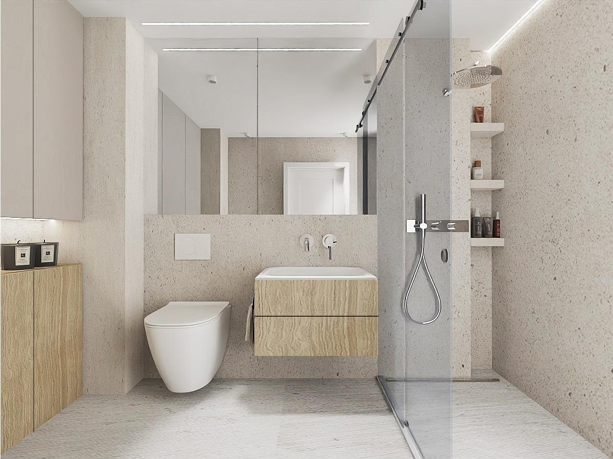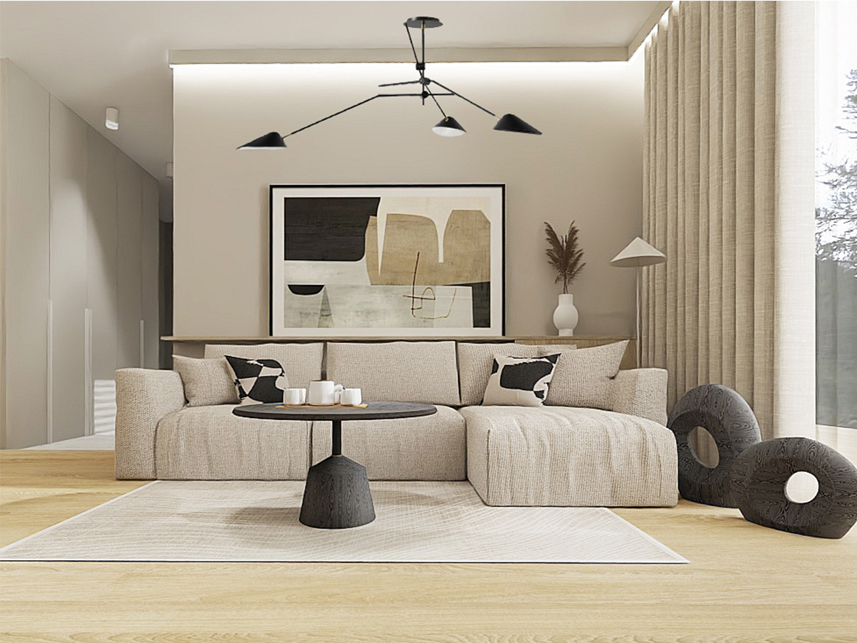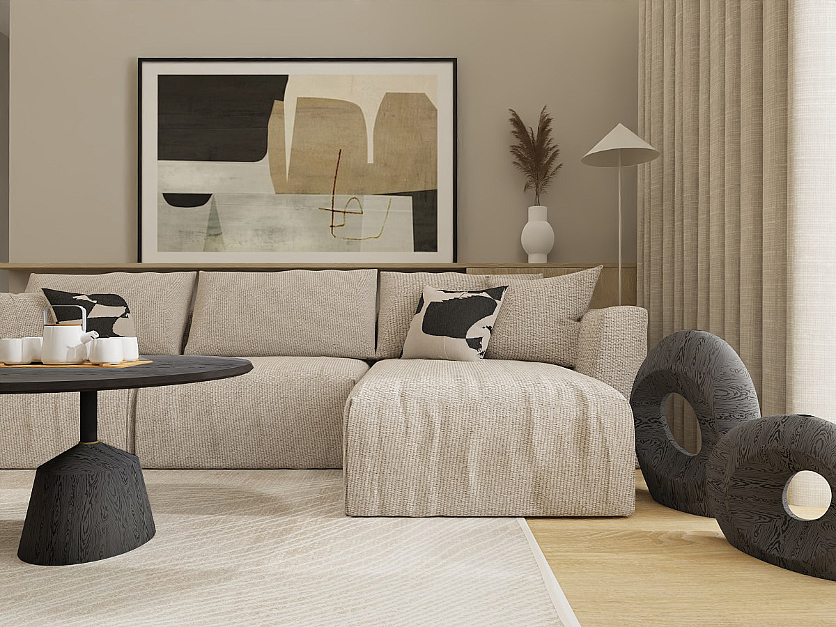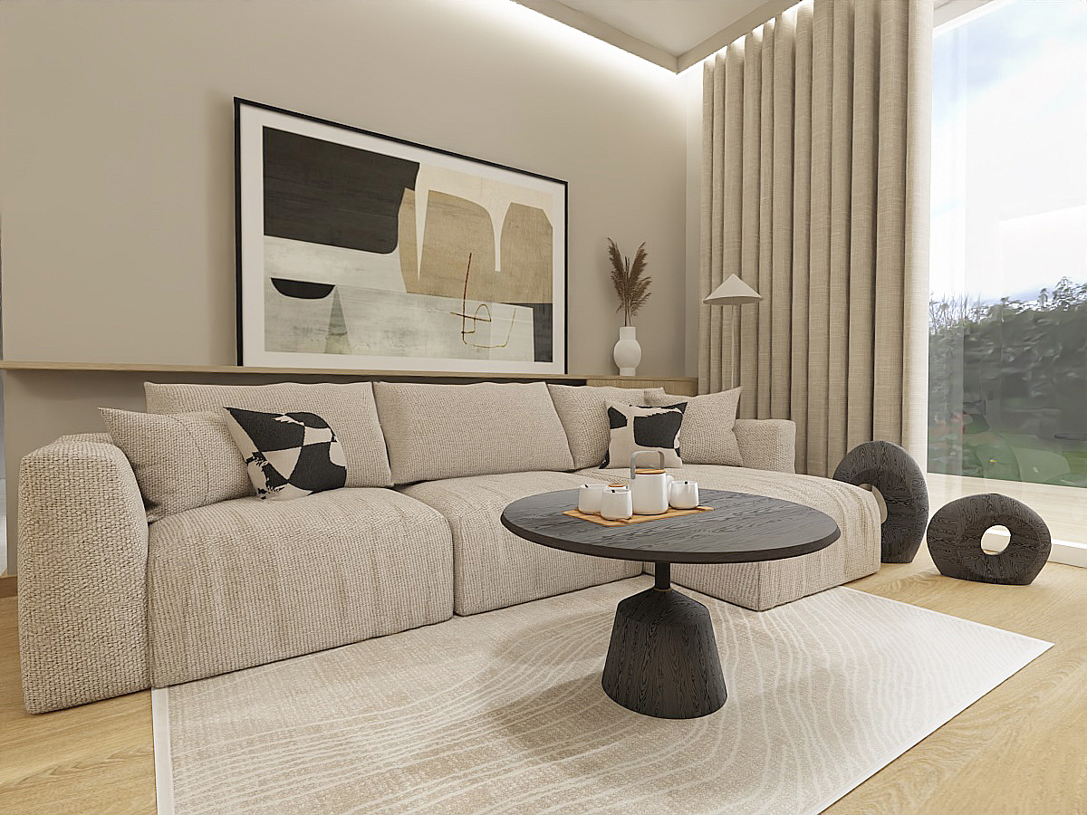 This layout perfectly meets the needs of someone working from home, providing a comfortable space for both work and relaxation. The kitchen, separate from the rest of the apartment, exudes tranquility with its use of light beige fronts and countertop, as well as wooden lower cabinets. This choice of colors and materials, including floor tiles, creates a harmonious space that is both functional and aesthetically pleasing. As the kitchen is open to the hallway, it was important for me to ensure that its color scheme is consistent with the rest of the living area.In the bedroom, I opted for a green accent wall, which research shows is most beneficial for calming and relaxation, while the remaining walls and high cabinetry in beige tones maintain consistency with the rest of the apartment. This creates an ideal retreat for unwinding after a long day. In the hallway, I designed a large storage unit with practical storage solutions in mind. The spacious wardrobe accommodates jackets and includes an organizational section as well as a niche with a shelf for keys. The flooring in the hallway and part of the kitchen is finished with elegant sand-colored tiles, adding a modern touch to the interior.