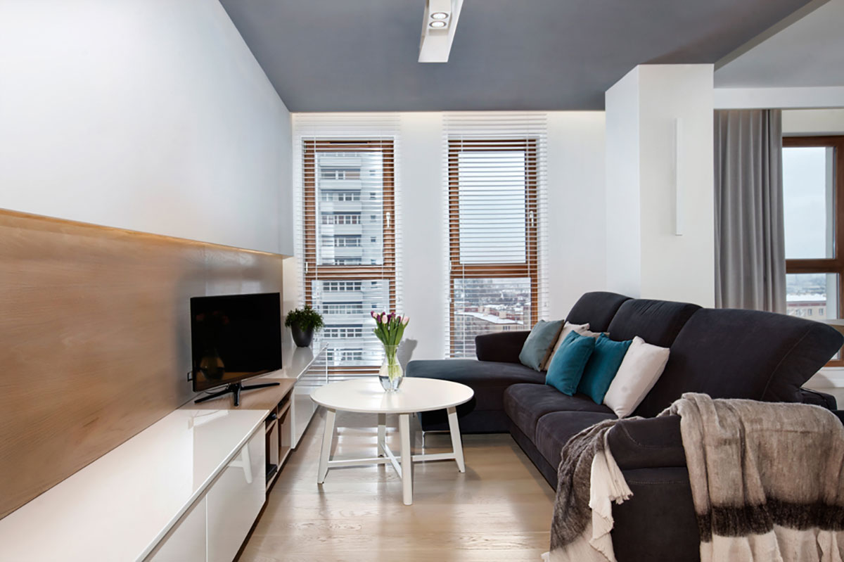 The design of the apartment in the developer's standard included changing the arrangement of partition walls and arranging all rooms together with construction supervision and putting a turnkey apartment. The bathroom has a beach accent on the illuminated wall mural that gives the owners positive associations.