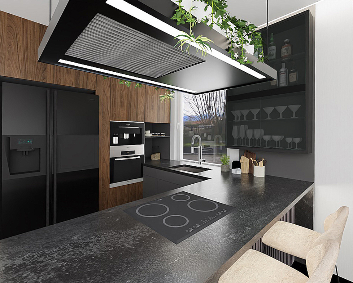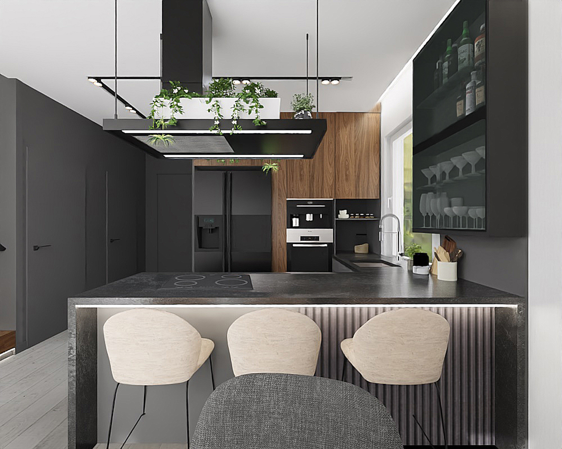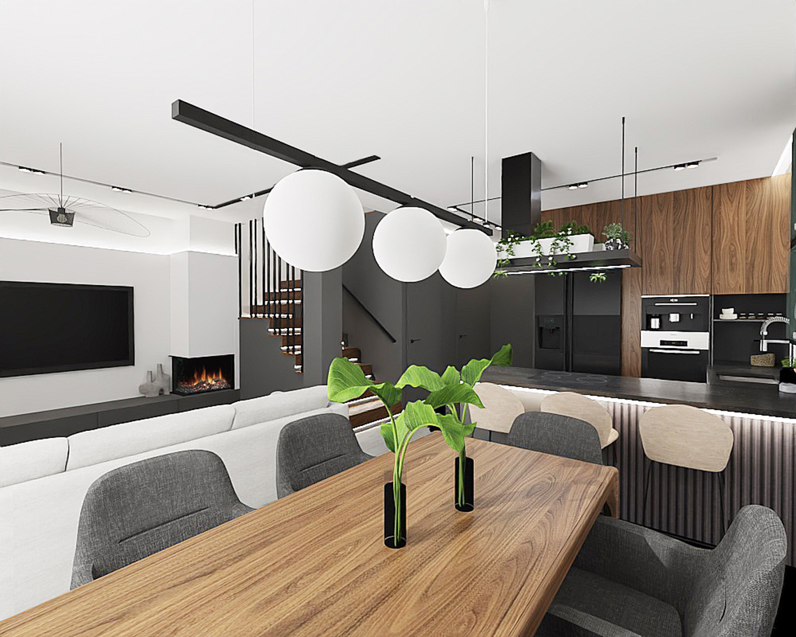 Parter domu jednorodzinnego stanowi otwarta przestrzeń salonu z kuchnią i jadalnią. Inwestorzy byli otwarci na odważne akcenty, co sprawiło, że powstało wnętrze nowoczesne i z charakterem. Centralnym punktem tej przestrzeni jest grafitowa kuchnia o ciemnych blatach i orzechowych frontach. Podcięcie w wyspie umożliwia zastosowanie niskich hokerów, dzięki czemu cały blat w kuchni jest umiejętnie zagospodarowany służąc jednocześnie jako blat roboczy i blat do spożywania posiłków. Dodatkowym akcentem przykuwającym wzrok jest zaprojektowana designerska ściana telewizyjna podświetlana taśmą led w salonie. Duża sofa w kolorze kremowym umożliwia komfortowe spędzanie czasu oraz wyznacza jednocześnie strefę salonu.