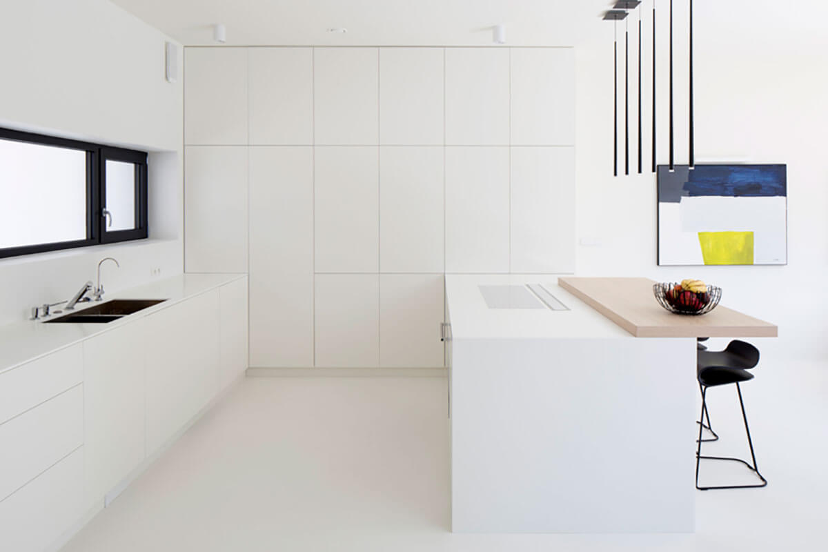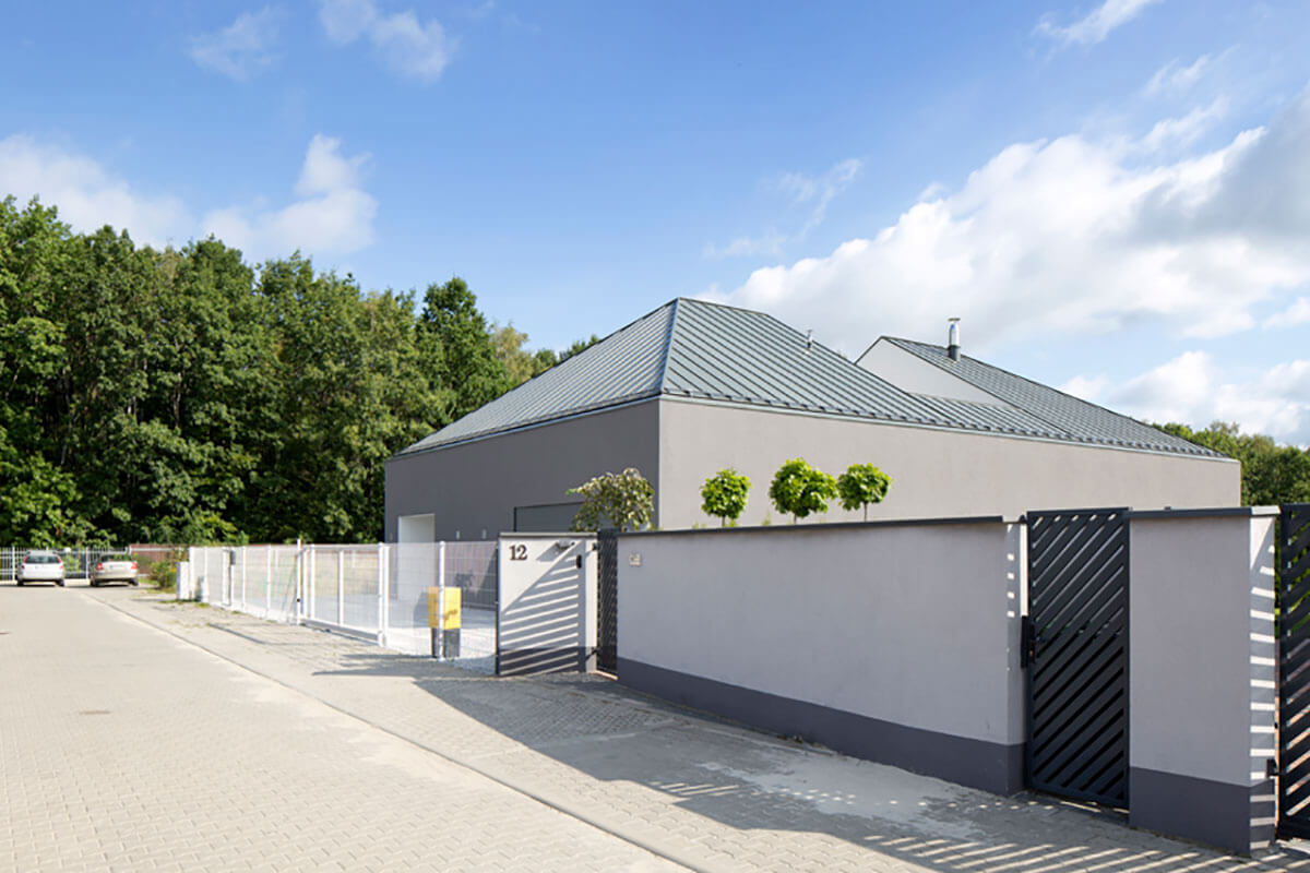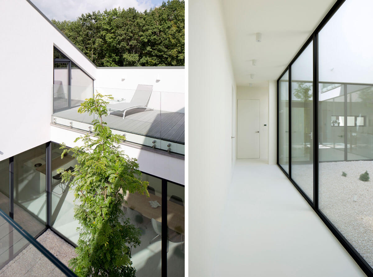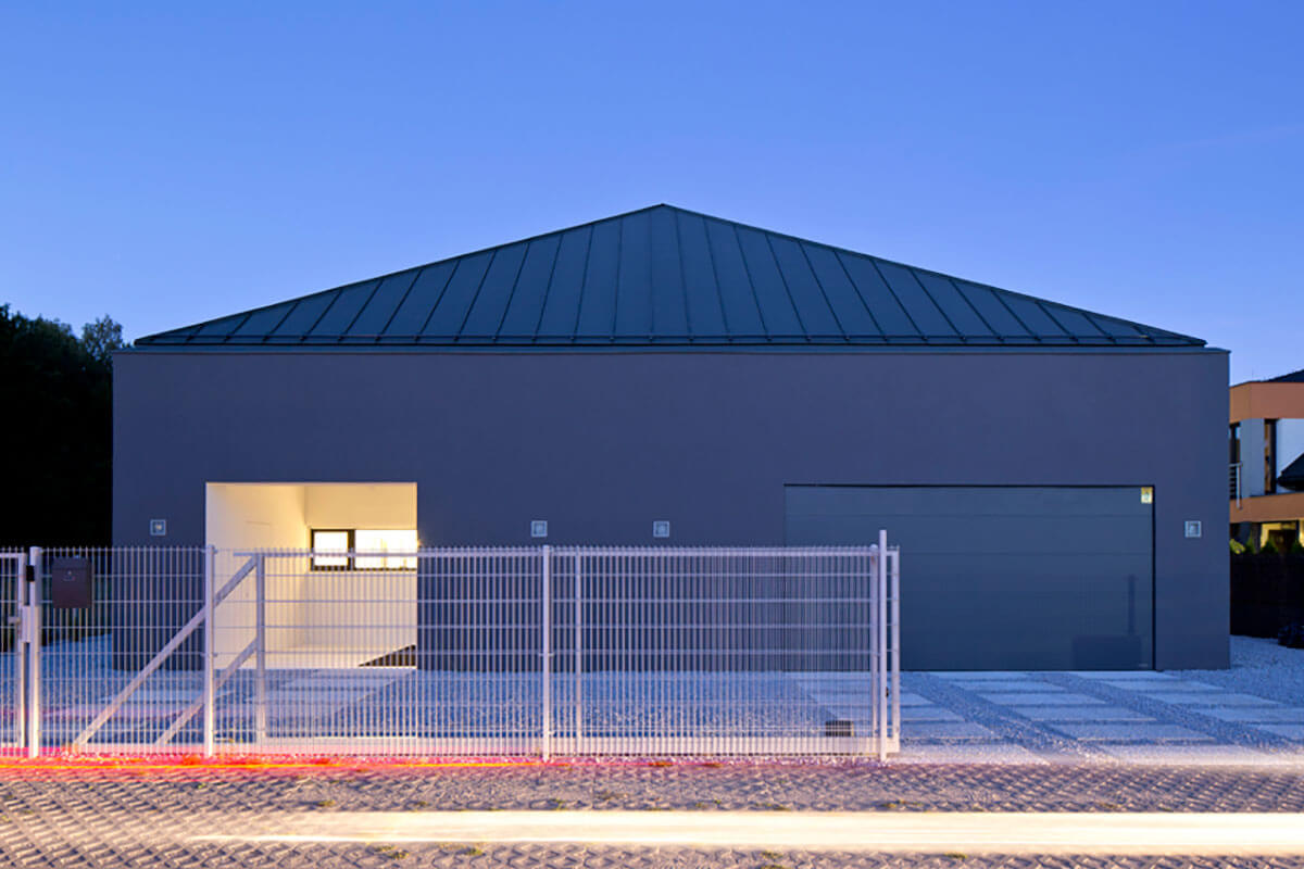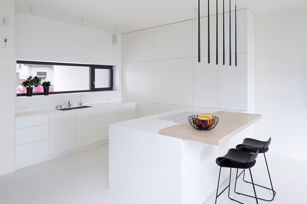 Dom jednorodzinny przeznaczony jest dla rodziny czteroosobowej. Klienci pragneli jasnych, minimalistycznych wnętrz w okrojonej gamie kolorystycznej. Głównym akcentem oraz ozdobą we wnętrzach stanowi piekne drzewo , które rośnie w samym sercu budynku w atrium, oddzielone jedynie szybami od reszty pomieszczeń. Nadaje to wnętrzom unikatowy charakter, wszystko dzięki zmieniającym się wraz z porami roku barwami liści oraz światło jakie wpada do środka wnętrz poprzez otwór w dachu i atrium. Na parterze znajduje się duża, otwarta przestrzeń strefy dziennej wraz z aneksem kuchennym i jadalnią, sypialnia główna z łazienką, łazienka gościnną oraz gabinet. Białe podłogi wykończone zostały żywicą epoksydową a ściany pomalowano na biało, również meble zaprojektowano o bardzo minimalistycznych i nowoczesnych formach. Dodatki przełamują całość. Duży, drewniany, rodzinny stół łączy domowników podczas posiłków a obrazy Iwony Bilskiej ozdabiają ściany. Schody wspornikowe prowadzą na piętro na którym znajdują się sypialnie dzieci oraz łazienka z sauną. Ta strefa przeznaczona jest dla młodszych domowników , których pokoje łączą się poprzez zewnętrzne tarasy poprowadzone wzdłuż atrium."Dom z atrium" znalazł się wśród 20 najlepszych domów w Polsce nominowanych w Plebiscycie "Polska Architektura 2016". https://sztuka-architektury.pl/gallery/details/338II miejsce w głosowaniu internetowym za "dom z atrium" nominowany wśród 20 najlepszych realizacji domów prywatnych w Plebiscycie Polska Architektura 2016 portalu Sztuka ArchitekturyProjekt architektoniczny został wykonany przez biuro Inostudio. http://www.inostudio.pl/dom-jednorodzinny-z-atrium Autorem zdjęć jest Marcin Grabowiecki