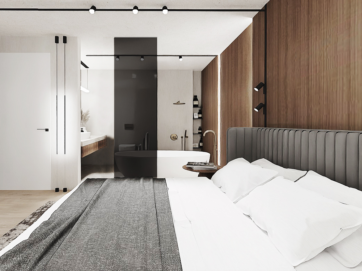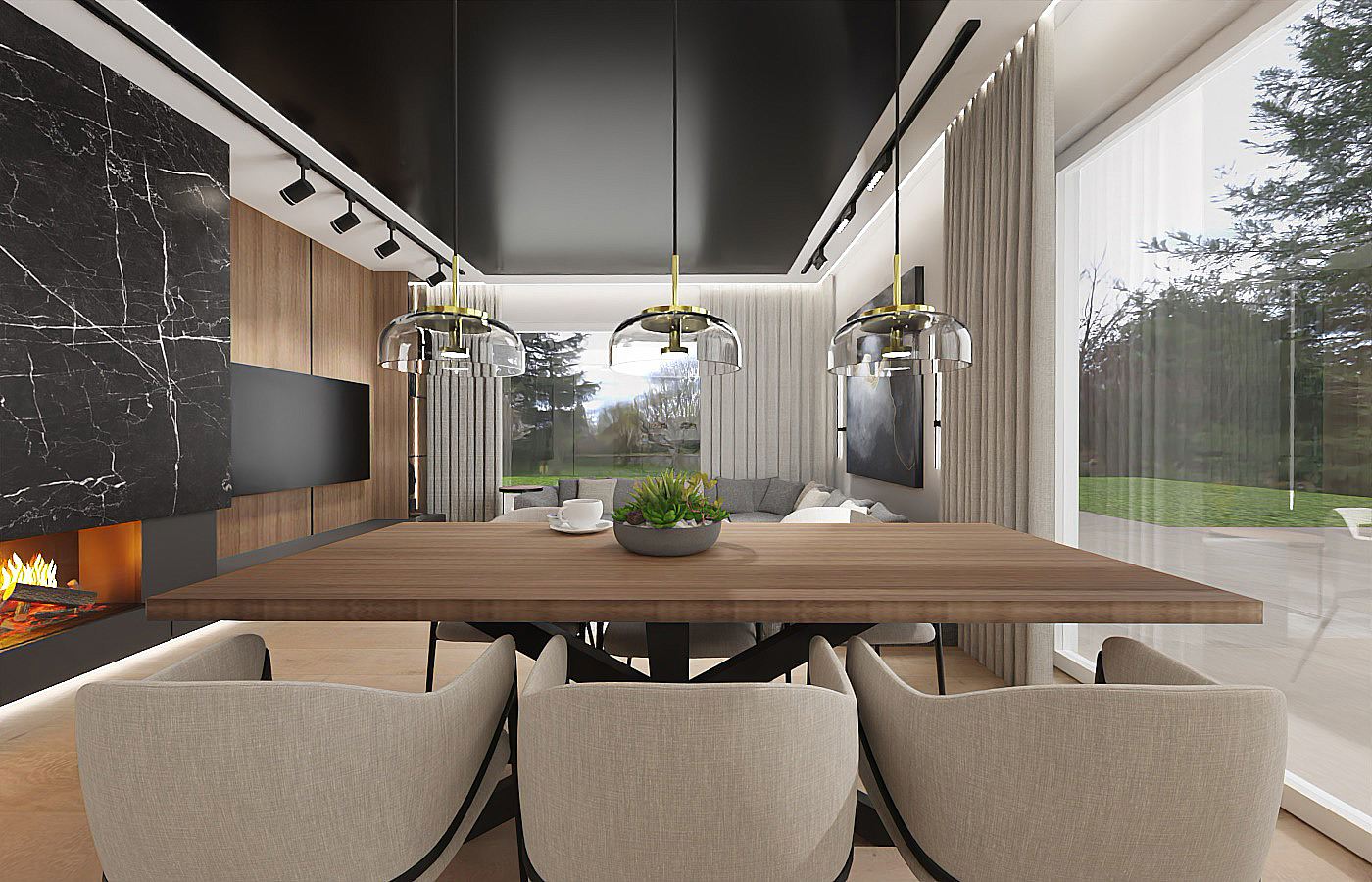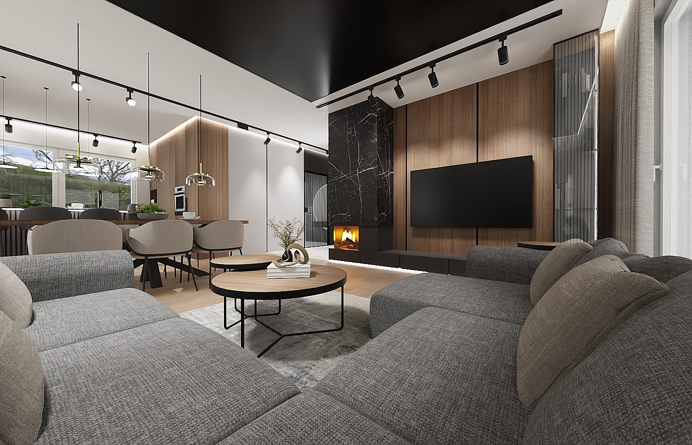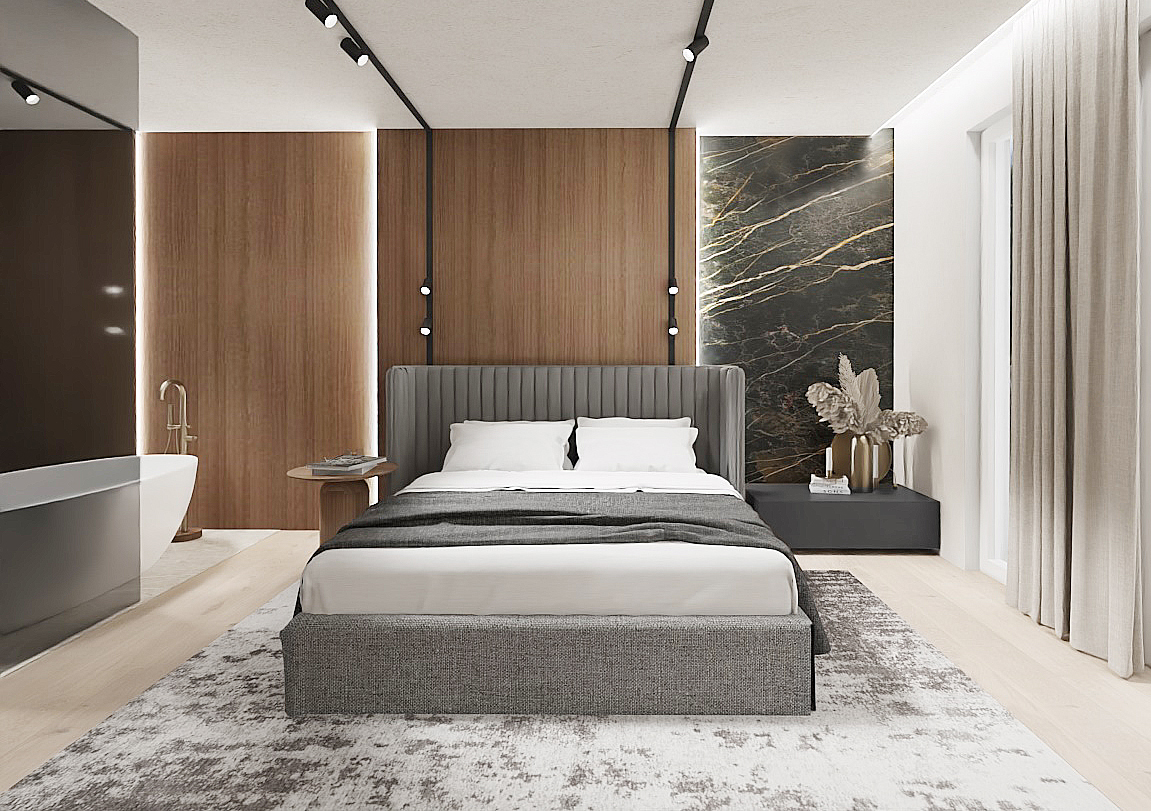 Zapraszam do odkrycia tego wyjątkowego projektu wnętrz, który nie tylko spełni Twoje najśmielsze marzenia o idealnym domu, ale także stanie się inspiracją do stworzenia własnej oazy spokoju i luksusu. Większość parteru stanowi otwarta przestrzeń, w której znajduje się strefa wypoczynkowa oraz otwarta kuchnia. Akcentem charakterystycznym w centrum jest kominek wykończony czarnym marmurem, który łączy się bezpośrednio ze ścianą telewizyjną. W salonie nie mogło zabraknąć wygodnego mebla wypoczynkowego w eleganckim grafitowym wykończeniu, który zapewnia komfortowe miejsce do odpoczynku po długim dniu. Strefę salonu od kuchni oddziela designerski drewniany stół na nowoczesnej czarnej nodze, stanowiący nie tylko funkcjonalne centrum, ale także estetyczny akcent całej przestrzeni. Przygotowanie posiłków staje się prawdziwą przyjemnością w kuchni, gdzie matowe czarne szafki stojące harmonijnie komponują się z drewnianą wysoką zabudową. Znajdziesz tutaj wszystko, czego potrzebujesz, włącznie z wygodnym wejściem do spizarni, co sprawia, że gotowanie staje się zarówno łatwe, jak i przyjemne.Na piętrze znajduje się strefa nocna, w której zaproponowaliśmy połączenie sypialni z łazienką i garderobą. W centralnej części sypialni znajduje się wygodne łóżko z tapicerowanym wezgłowiem, które zaprasza do błogiego odpoczynku po całym dniu. Ale to nie wszystko - tuż za łóżkiem znajduje się imponująca ściana fornirowana, podświetlana taśmą LED, dodająca wnętrzu elegancji i niepowtarzalnego charakteru. Łazienka połączona z sypialnią to prawdziwa strefa relaksu i odprężenia. Szklana przyciemniana ściana oddziela te dwie przestrzenie, zapewniając prywatność, ale jednocześnie zachowując poczucie przestronności i światła. W łazience znajdziesz wszystko, czego potrzebujesz do relaksującej kąpieli - wanna, prysznic oraz miska WC i elegancka umywalka na dużej szafce, harmonijnie współgrającej z resztą wnętrza. Naprzeciwko łóżka znajduje się otwarta garderoba, wykonana z wysokiej jakości forniru i podświetlana taśmami LED, co dodaje wnętrzu nie tylko funkcjonalności, ale także stylowego wykończenia. To idealne miejsce na przechowywanie ubrań i dodatków, zachowując jednocześnie porządek i elegancję. Zapraszamy do odkrycia tego wyjątkowego projektu wnętrz, który nie tylko spełni Twoje najskrytsze marzenia o idealnej sypialni, ale także stanie się inspiracją do stworzenia własnej strefy relaksu i luksusu w Twoim domu.