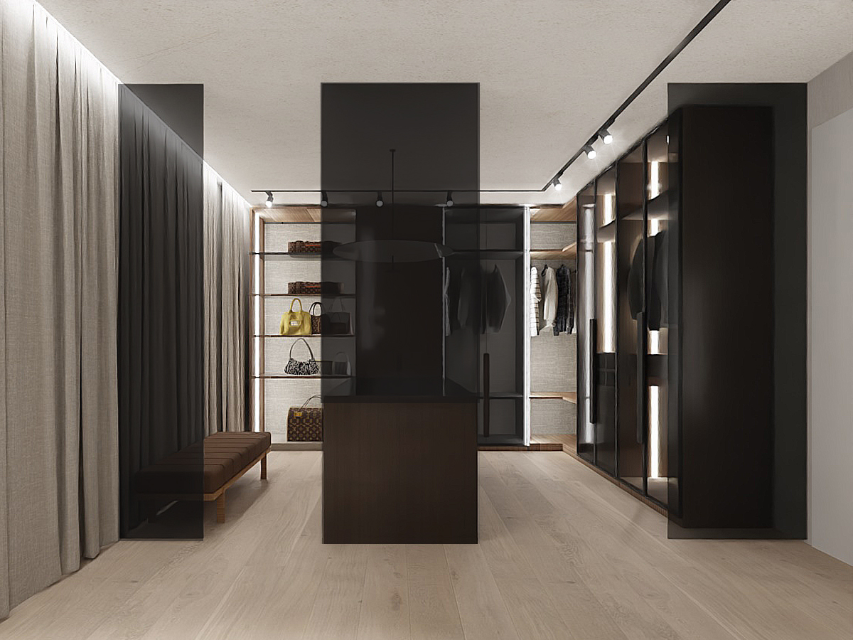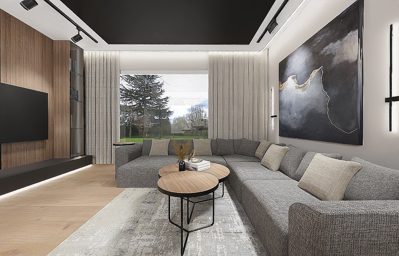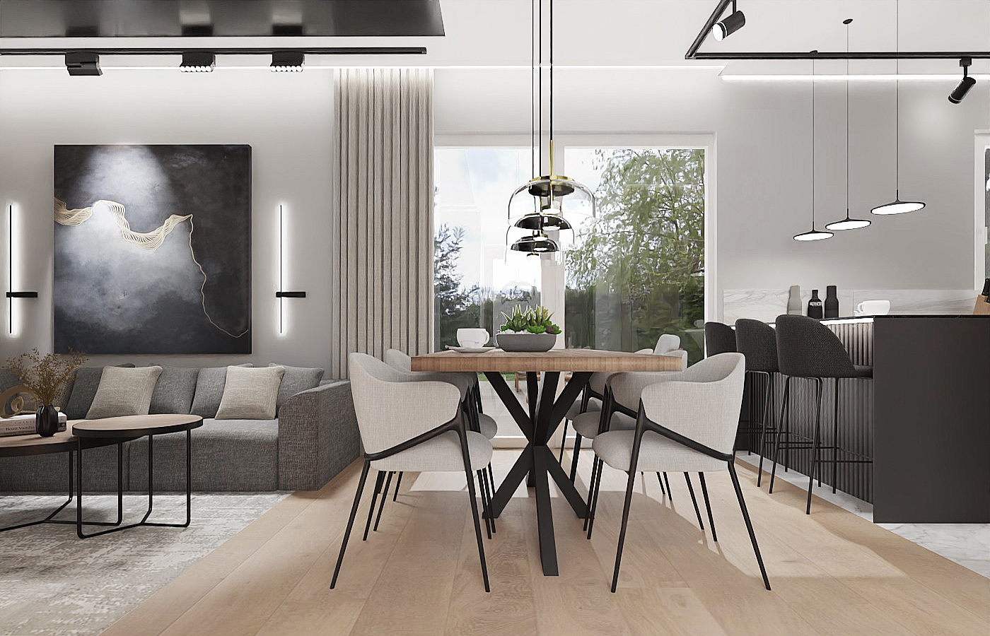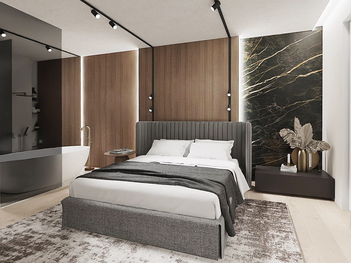 Zapraszam do odkrycia tego wyjątkowego projektu wnętrz, który nie tylko spełni Twoje najśmielsze marzenia o idealnym domu, ale także stanie się inspiracją do stworzenia własnej oazy spokoju i luksusu. Większość parteru stanowi otwarta przestrzeń, w której znajduje się strefa wypoczynkowa oraz otwarta kuchnia. Akcentem charakterystycznym w centrum jest kominek wykończony czarnym marmurem, który łączy się bezpośrednio ze ścianą telewizyjną. W salonie nie mogło zabraknąć wygodnego mebla wypoczynkowego w eleganckim grafitowym wykończeniu, który zapewnia komfortowe miejsce do odpoczynku po długim dniu. Strefę salonu od kuchni oddziela designerski drewniany stół na nowoczesnej czarnej nodze, stanowiący nie tylko funkcjonalne centrum, ale także estetyczny akcent całej przestrzeni. Przygotowanie posiłków staje się prawdziwą przyjemnością w kuchni, gdzie matowe czarne szafki stojące harmonijnie komponują się z drewnianą wysoką zabudową. Znajdziesz tutaj wszystko, czego potrzebujesz, włącznie z wygodnym wejściem do spizarni, co sprawia, że gotowanie staje się zarówno łatwe, jak i przyjemne.Na piętrze znajduje się strefa nocna, w której zaproponowaliśmy połączenie sypialni z łazienką i garderobą. W centralnej części sypialni znajduje się wygodne łóżko z tapicerowanym wezgłowiem, które zaprasza do błogiego odpoczynku po całym dniu. Ale to nie wszystko - tuż za łóżkiem znajduje się imponująca ściana fornirowana, podświetlana taśmą LED, dodająca wnętrzu elegancji i niepowtarzalnego charakteru. Łazienka połączona z sypialnią to prawdziwa strefa relaksu i odprężenia. Szklana przyciemniana ściana oddziela te dwie przestrzenie, zapewniając prywatność, ale jednocześnie zachowując poczucie przestronności i światła. W łazience znajdziesz wszystko, czego potrzebujesz do relaksującej kąpieli - wanna, prysznic oraz miska WC i elegancka umywalka na dużej szafce, harmonijnie współgrającej z resztą wnętrza. Naprzeciwko łóżka znajduje się otwarta garderoba, wykonana z wysokiej jakości forniru i podświetlana taśmami LED, co dodaje wnętrzu nie tylko funkcjonalności, ale także stylowego wykończenia. To idealne miejsce na przechowywanie ubrań i dodatków, zachowując jednocześnie porządek i elegancję. Zapraszamy do odkrycia tego wyjątkowego projektu wnętrz, który nie tylko spełni Twoje najskrytsze marzenia o idealnej sypialni, ale także stanie się inspiracją do stworzenia własnej strefy relaksu i luksusu w Twoim domu.