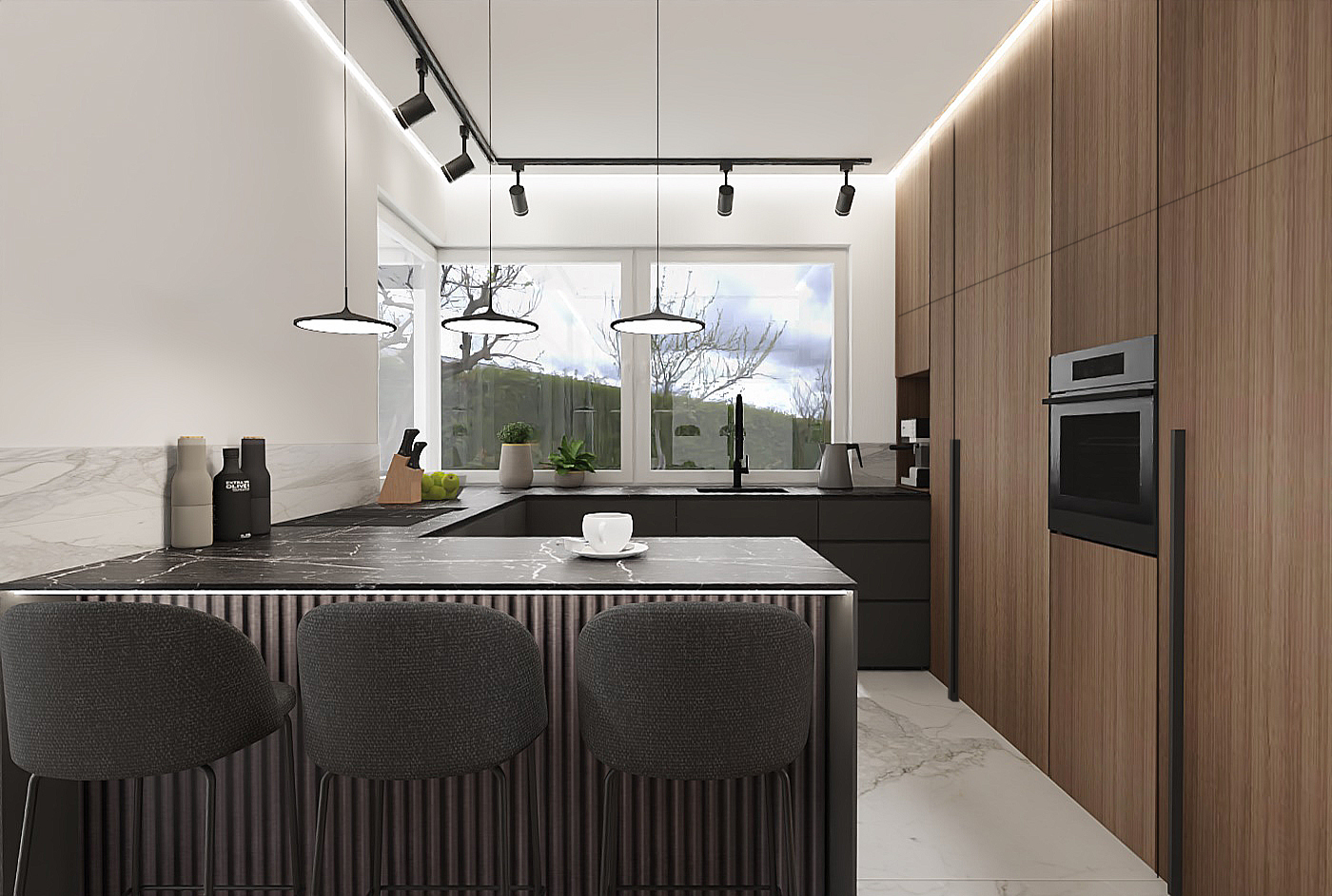 ELEGANCKI DOM: NOWOCZESNA ARANŻACJA Z DREWNEM, BIAŁYM i CZARNYM MARMUREM