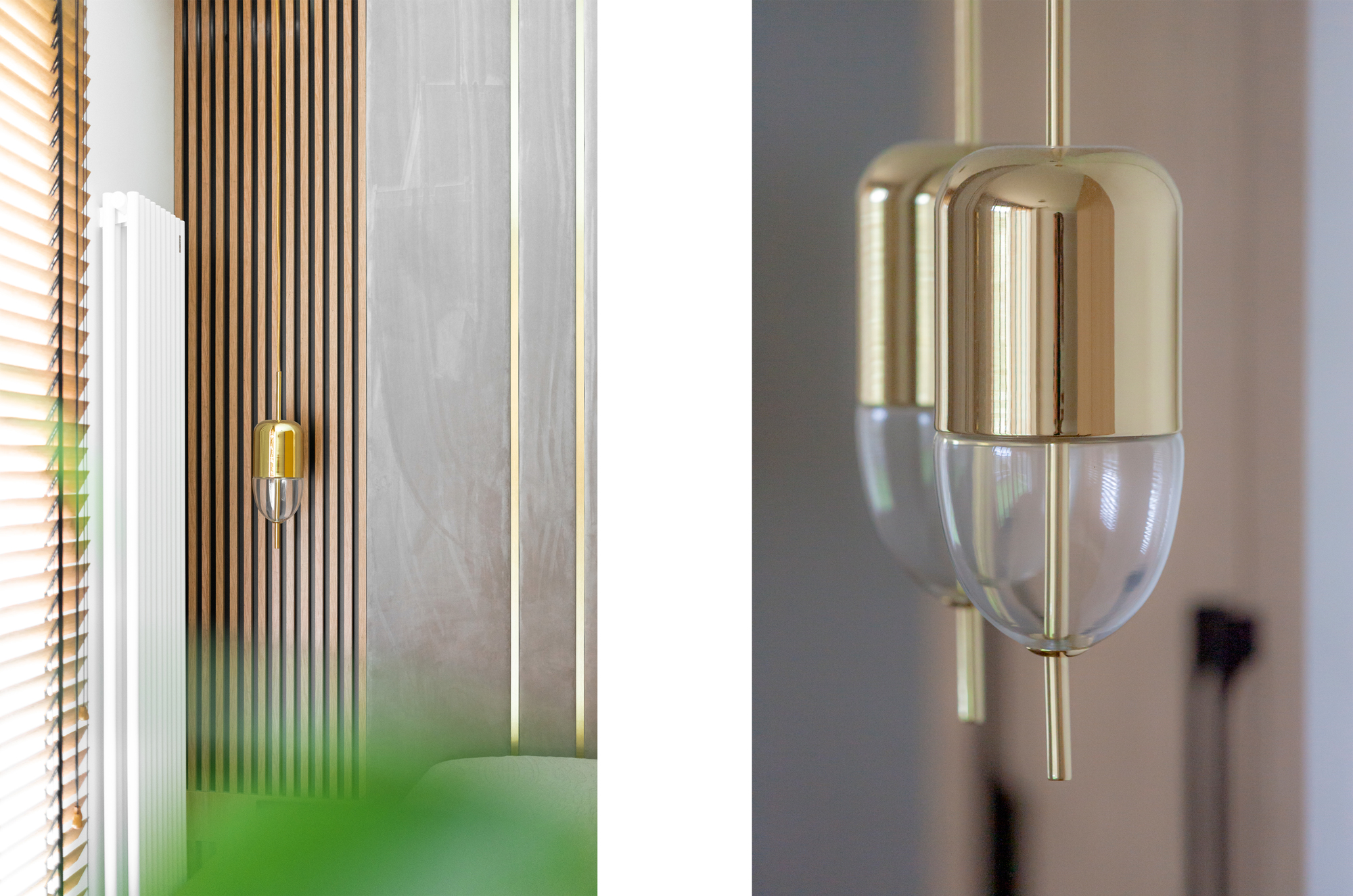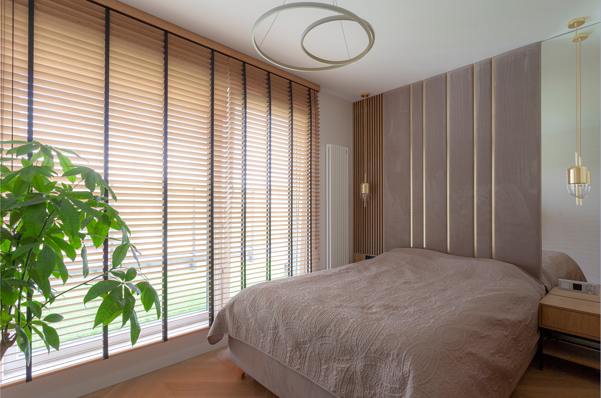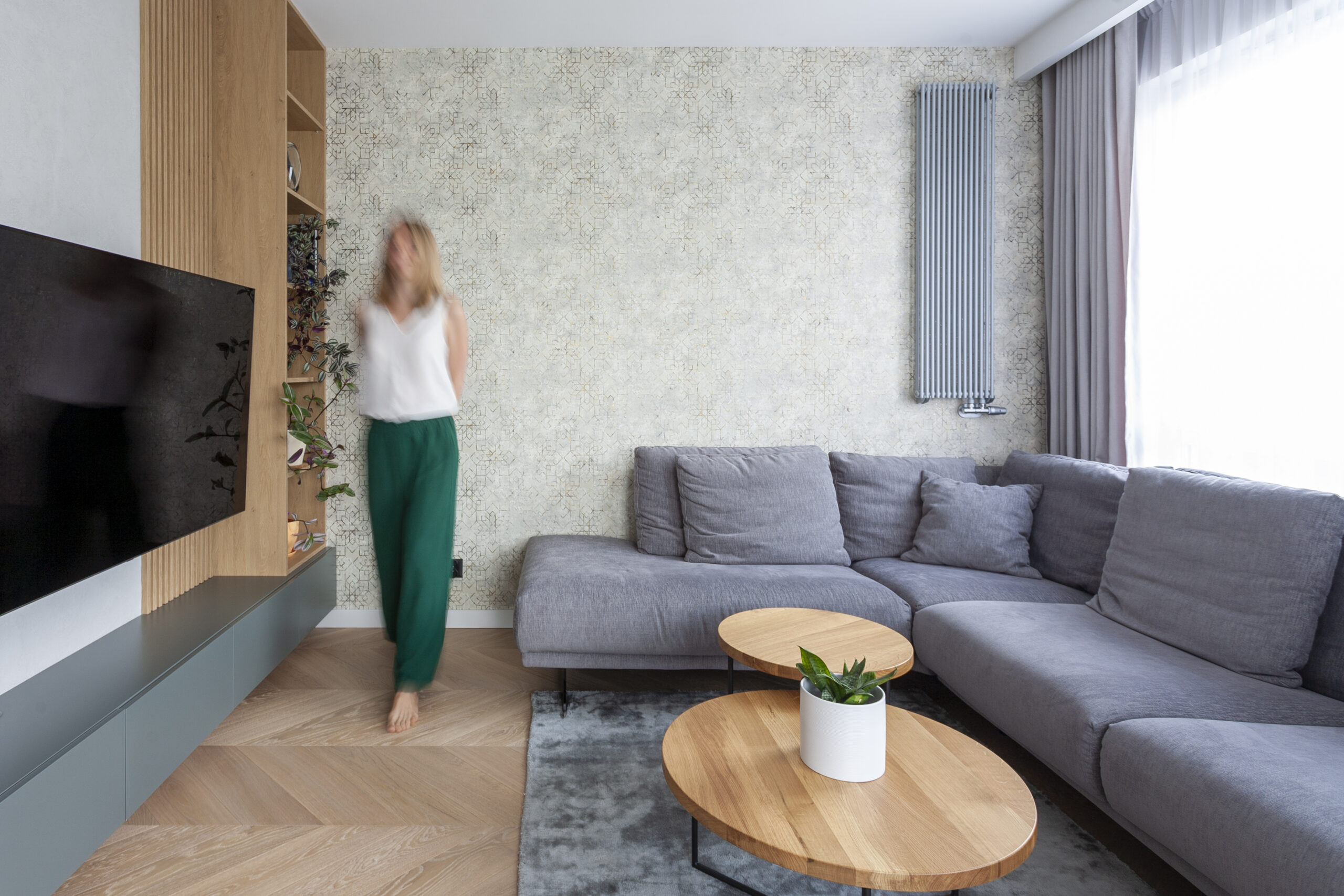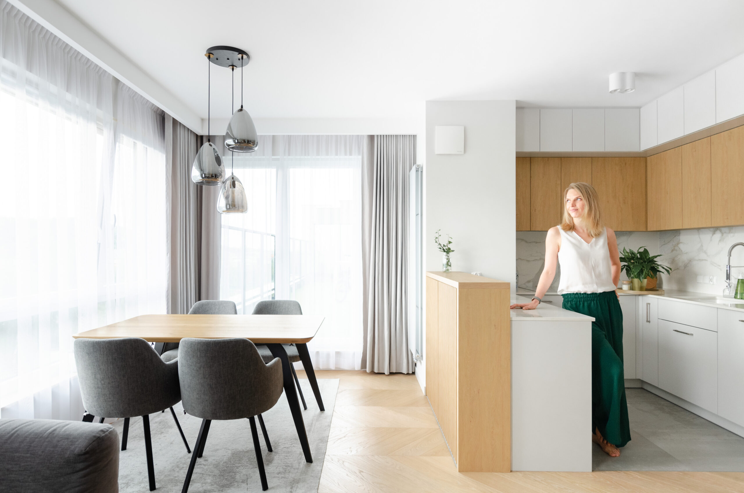 Aranżacja wnętrza mieszkania została stworzona dla rodziny 2+2 na osiedlu BMC - ORO Oliwa złoty środek Trójmiasta. Ten przepiękny apartament znajduje się w samym sercu Trójmiasta z widokiem na las. Znajdziemy tu cztery pokoje , duży otwarty salon z aneksem kuchennym, dwie łazienki oraz taras na dachu o powierzchni 50m2 . Po wejściu do mieszkania rozpościera nam się otwarta przestrzeń z dużymi oknami. Aranżacja wnętrz bazuje na połączeniu jasnych szarości z ciepłym odcieniem drewna. To materiał naturalny i przyjemny w dotyku. Znalazł się więc zarówno na podłodze, jak i w strefie jadalnianej, w postaci drewnianego blatu stołu oraz w strefie kuchennej na półwyspie i zabudowie. Dodatkowy element ozdobny stanowią drewniane lamele , które zastosowano przy ścianie telewizyjnej oraz na boku półwyspy. Jako ,że drewno stanowi element wspólny dla wszystkich pomieszczeń , możemy je również znaleźć zarówno jak i na meblach w sypialni i korytarzu czy gabinecie jak i w łazienkach , w których świetnie się kontrastuje z grafitowymi płytkami, które tam występują. Sypialnia stanowi oazę w której głównym elementem dekoracji wnętrza stanowi akcent w postaci wezgłowia pikowanego i poprowadzonego aż do sufitu ze złotymi ozdobnymi lampami po bokach. Udało się w niej zaaranżować przytulny kącik z otwartymi półkami na książki oraz fotelem, na którym można się zrelaksować po ciężkim dniu pracy. Właściciele pragnęli aby wszystkie pomieszczenia były spójne stylistycznie, dlatego też łazienki nawiązują zestawieniem kolorystycznym do reszty mieszkania. W łazience gościnnej w wysokiej drewnianej zabudowie znajduje się pralka wraz z suszarką oraz przestronny prysznic. Druga natomiast znajduje się w strefie sypialni i jest używana tylko przez właścicieli , co stanowi bardzo komfortowe rozwiązanie w użytkowaniu.Zdjęcia: Krzysztof Rudek oraz Jakub Depka