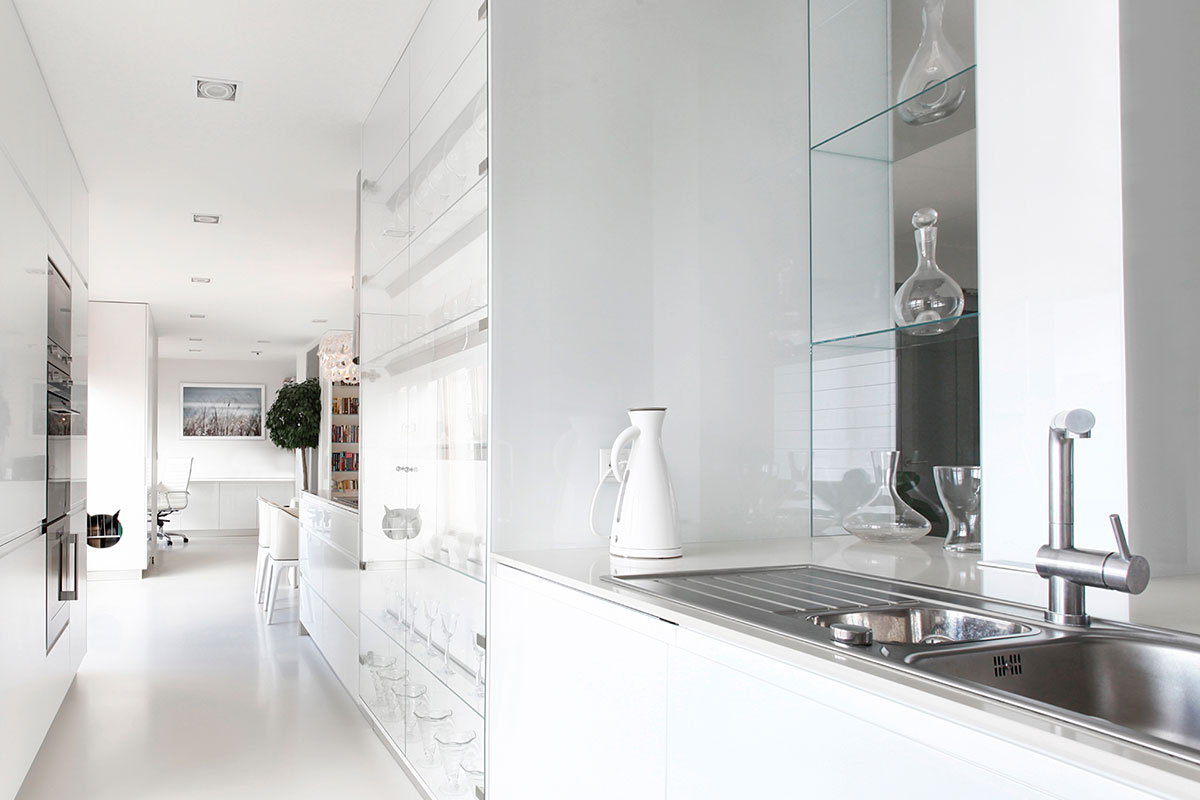 Mieszkanie znajduje się w nowo wybudowanej inwestycji w centrum Gdyni Art Deco. Układ ścian działowych został przekształcony a funkcje pomieszczeń zmienione, dzięki czemu mieszkanie stało się dużo bardziej przestronne. W centralnej części mieszkania zlokalizowana jest kuchnia o nietypowej, nowoczesnej formie. Główne zamierzenie jakie chciał uzyskać inwestor to jasne przestronne mieszkanie, co nasunęło zastosowanie wylewek poliuretanowych na podłogach. To rozwiązanie wraz z zastosowaniem ogrzewania podłogowego sprawdza się idealnie, domownicy pokochali chodzić boso. Całość ożywiają turkusowe dodatki , oraz zdjęcia z widokami morza. Projekt zrealizowany z nadzorem autorskim.
