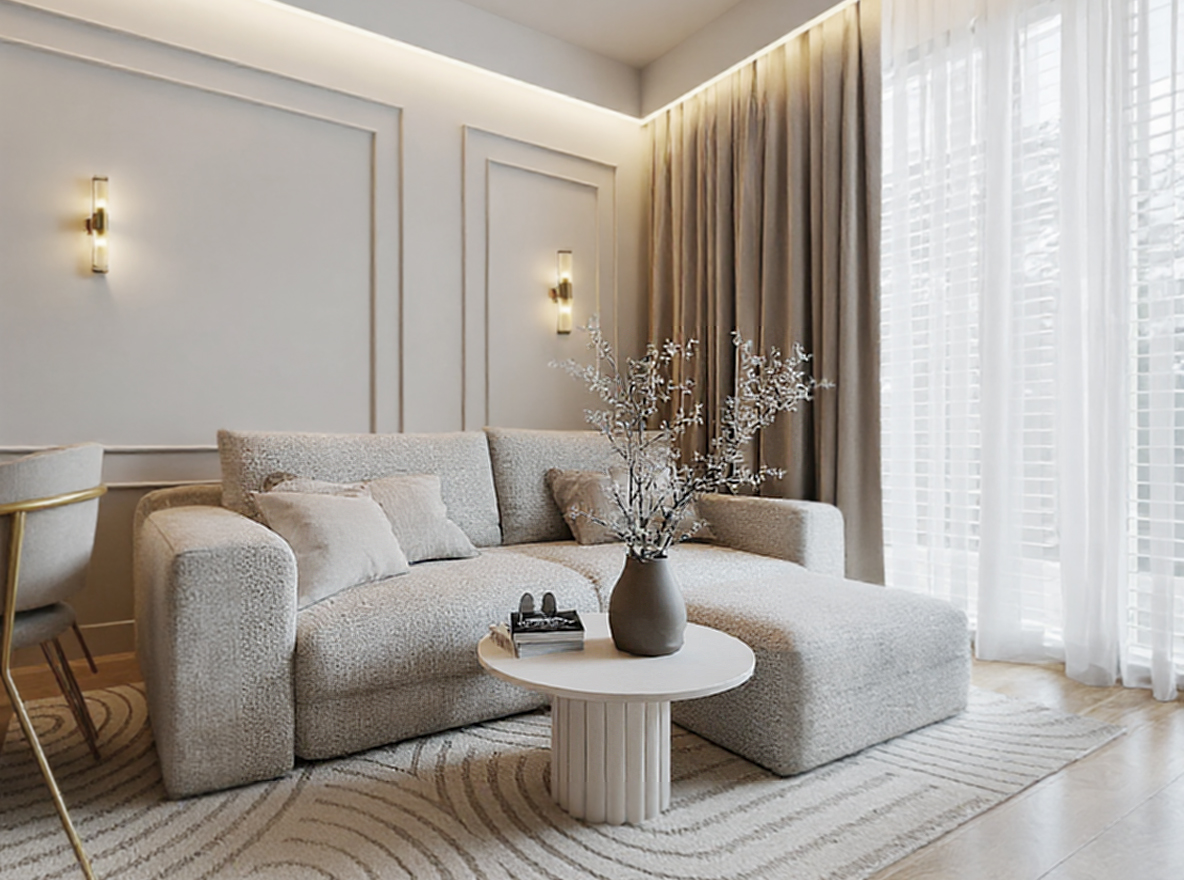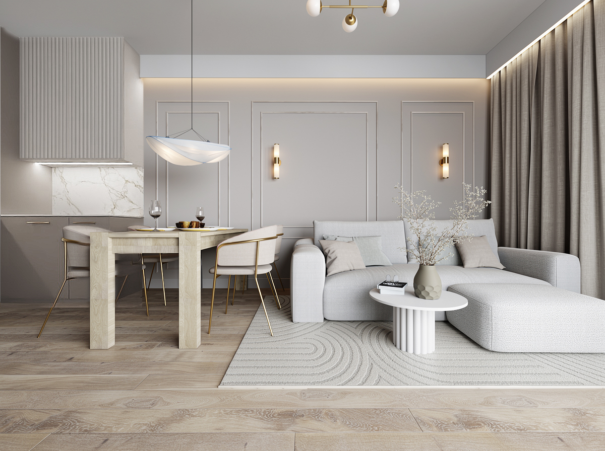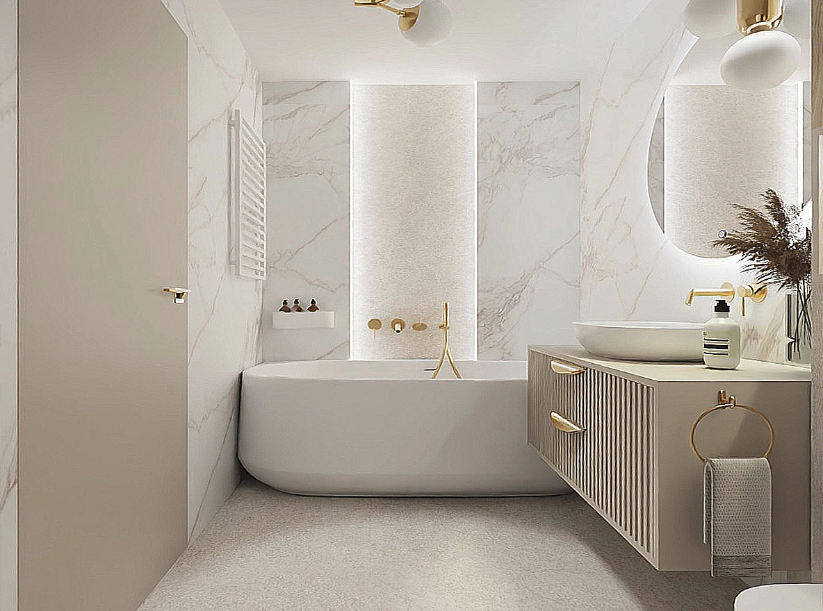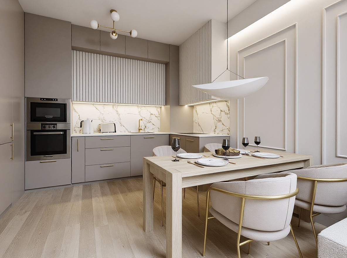 Eleganckie mieszkanie o powierzchni 43 m² w Gdańsku zostało zaprojektowane z myślą o młodej, kobiecej właścicielce, łącząc subtelność z funkcjonalnością. Otwarta strefa dzienna obejmuje salon z sofą boucle, kuchnię w kaszmirowych odcieniach z marmurowymi blatami oraz duży stół jadalniany. Sypialnia utrzymana w ciepłych beżach zachwyca sztukaterią i rozłożystym łóżkiem, a łazienka harmonijnie łączy kaszmirowe tony ze złotymi akcentami i drewnianymi elementami. Całość uzupełniają eleganckie detale, podświetlane lustra oraz ryflowane fronty, nadając wnętrzu przytulnego luksusu.
