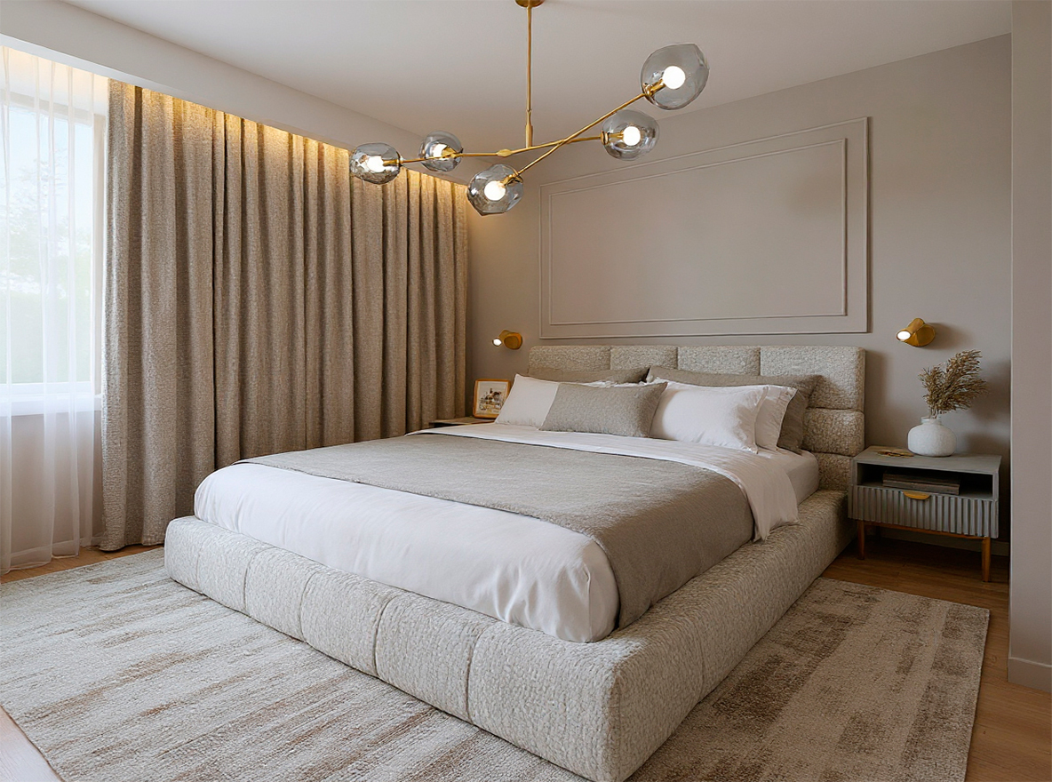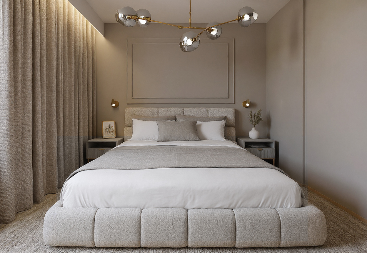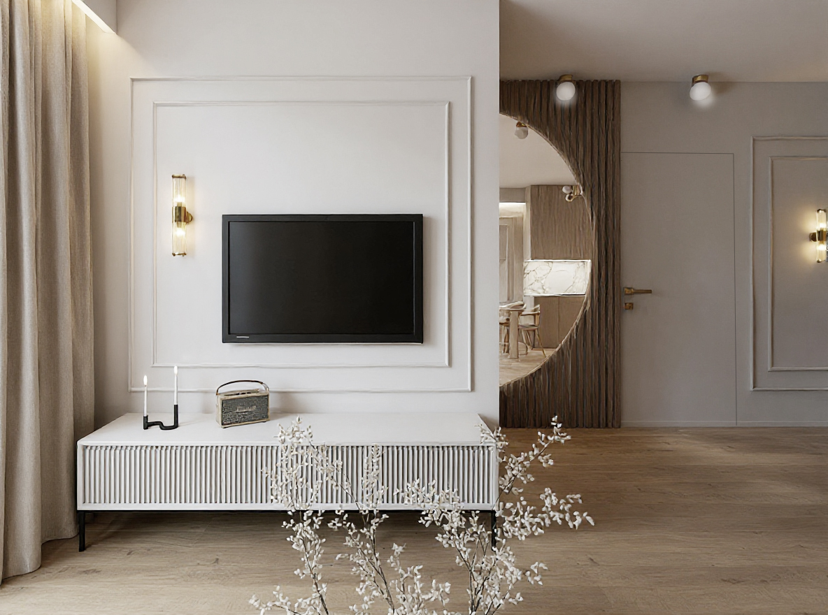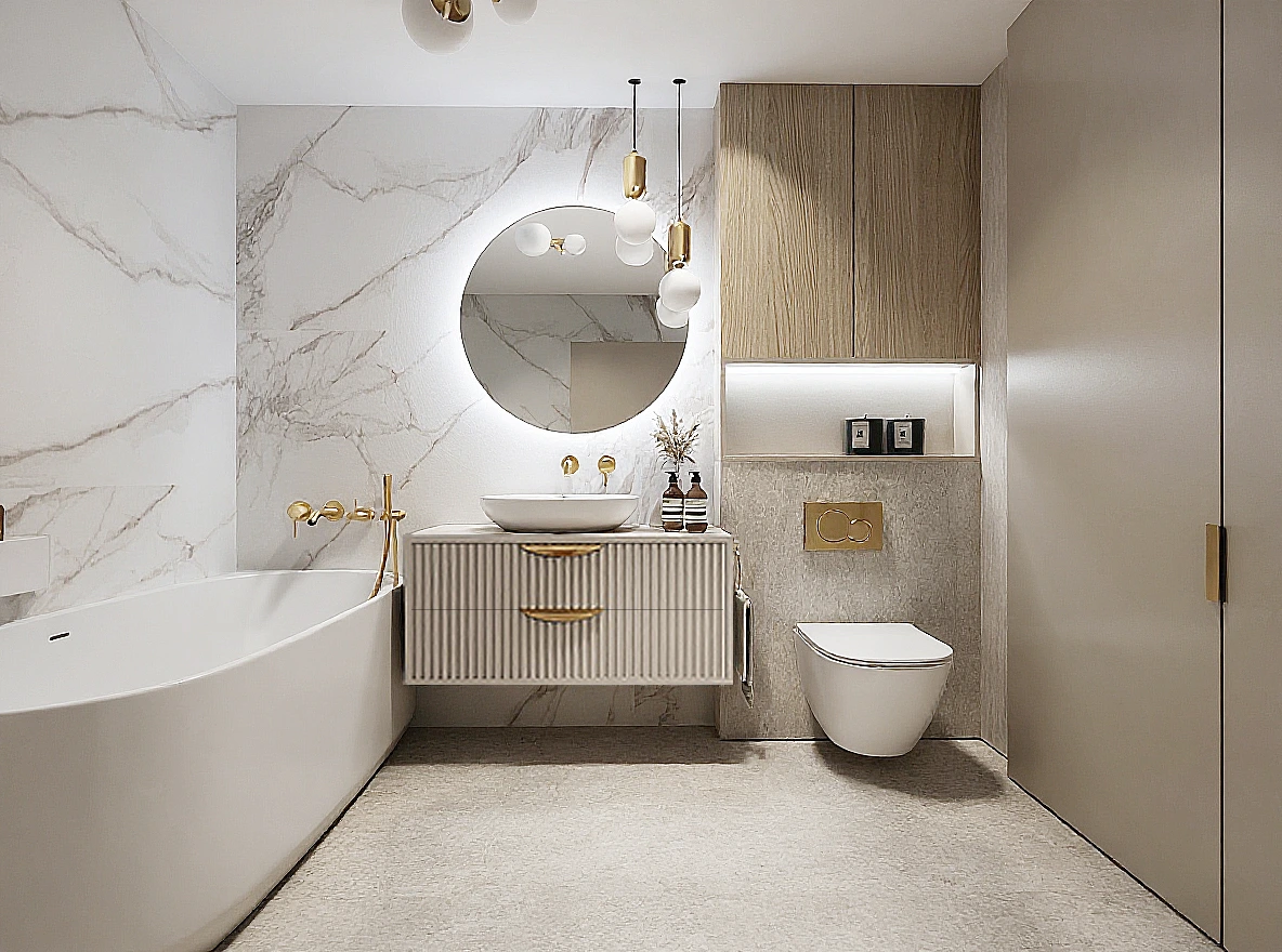 Eleganckie mieszkanie o powierzchni 43 m² w Gdańsku zostało zaprojektowane z myślą o młodej, kobiecej właścicielce, łącząc subtelność z funkcjonalnością. Otwarta strefa dzienna obejmuje salon z sofą boucle, kuchnię w kaszmirowych odcieniach z marmurowymi blatami oraz duży stół jadalniany. Sypialnia utrzymana w ciepłych beżach zachwyca sztukaterią i rozłożystym łóżkiem, a łazienka harmonijnie łączy kaszmirowe tony ze złotymi akcentami i drewnianymi elementami. Całość uzupełniają eleganckie detale, podświetlane lustra oraz ryflowane fronty, nadając wnętrzu przytulnego luksusu.