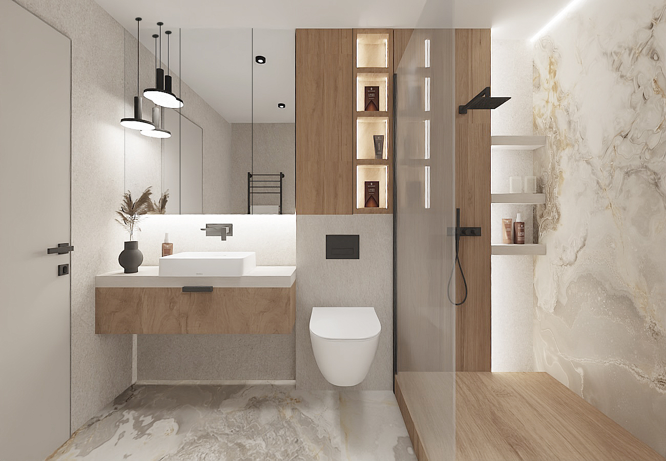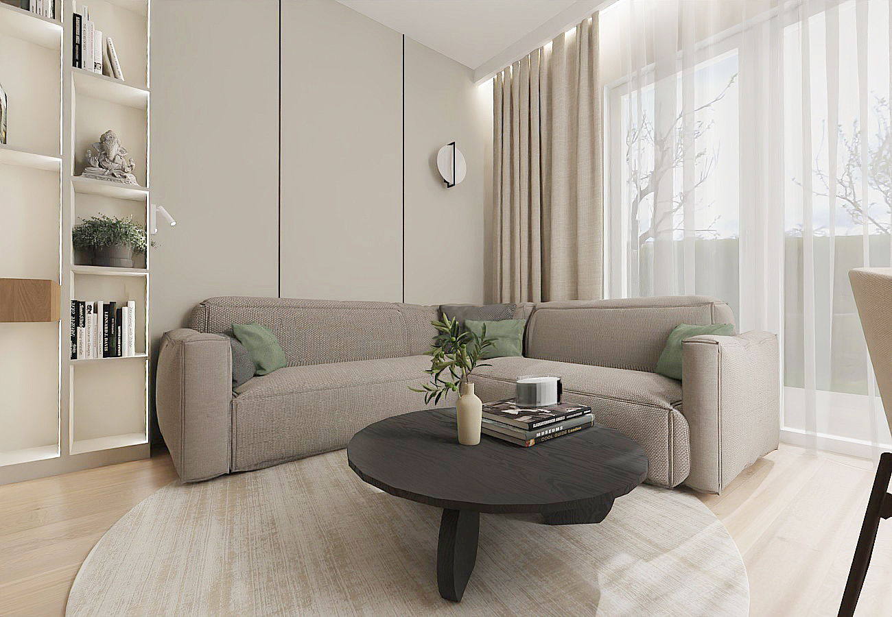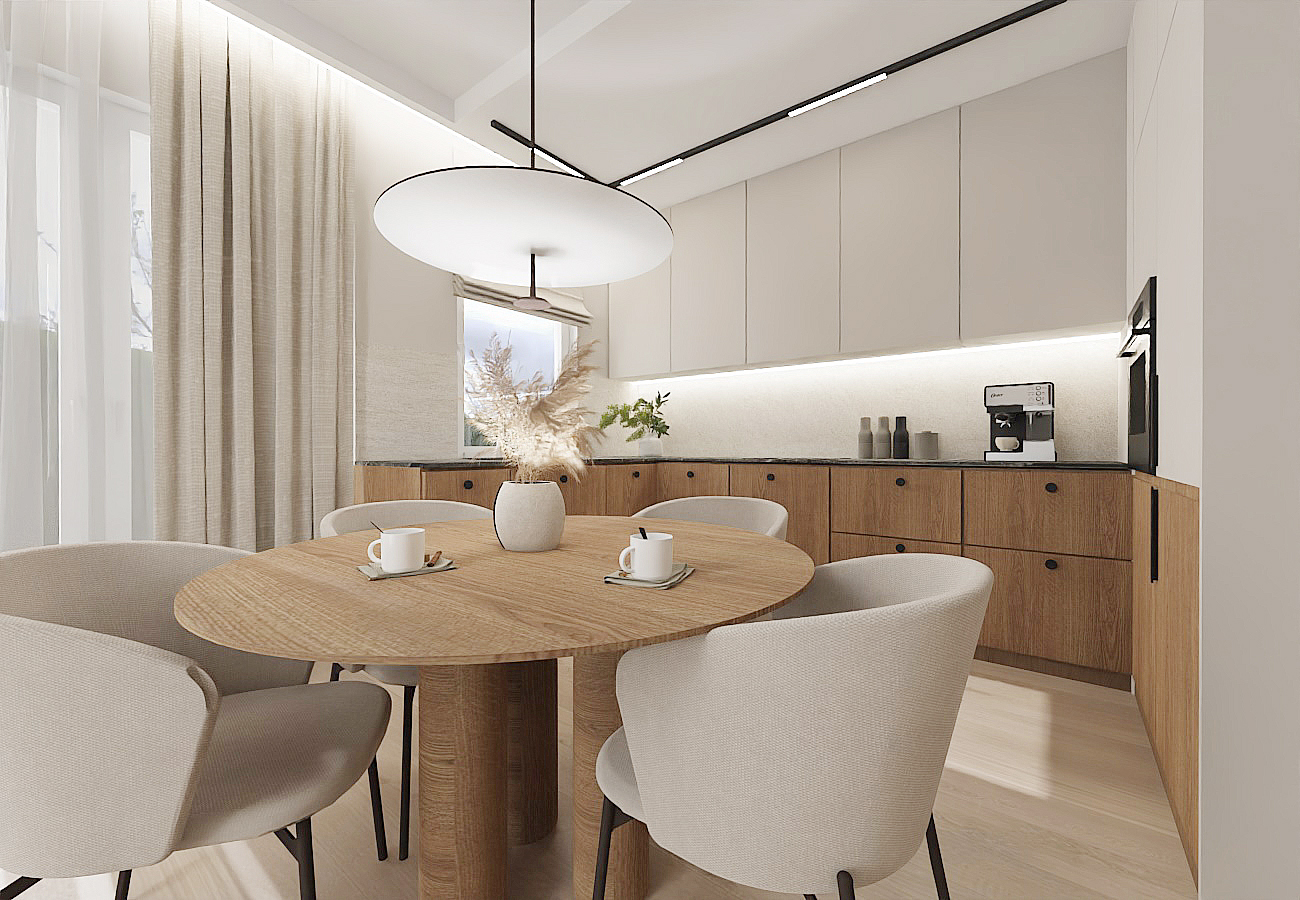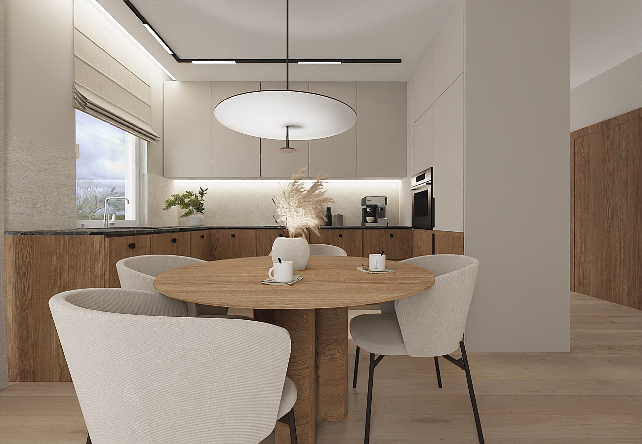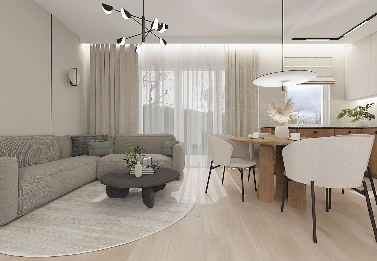Mieszkanie o powierzchni 65 m², znajdujące się na nowoczesnym osiedlu Perspektywa w Gdańsku, to doskonały przykład przemyślanego projektu wnętrz, który łączy funkcjonalność z estetyką. Zaprojektowane w stylu nowoczesnym i ponadczasowym, to mieszkanie stanowi idealne rozwiązanie dla osób poszukujących przestrzeni, która nie tylko spełnia ich codzienne potrzeby, ale także odzwierciedla ich styl życia. Każdy element tej aranżacji wnętrz został starannie przemyślany i dopasowany do potrzeb właścicieli, dzięki czemu przestrzeń jest zarówno komfortowa, jak i elegancka. Mieszkanie składa się z trzech pokoi: salonu z aneksem kuchennym, sypialni oraz gabinetu. Przestronny salon pełni funkcję serca mieszkania, łącząc w sobie przestrzeń do odpoczynku, pracy i spotkań z rodziną oraz przyjaciółmi. W strefie wypoczynkowej znajduje się narożna sofa, która zapewnia wygodne miejsce do relaksu oraz przyjmowania gości. Właściciele pracują zdalnie, więc w salonie musiała pojawić się przestrzeń pełniąca funkcję"biura-w-domu". W zabudowie pojawiło się duże biurko z miejscem do pracy oraz wysoka zabudowa z zamkniętymi frontami - przeznaczona na dokumenty i książki. Dzięki umiejętnemu zaprojektowaniu tego miejsca, pomimo niewielkiej przestrzeni, udało się stworzyć komfortowe warunki do pracy zdalnej. Aneks kuchenny stanowi zabudowa meblowa, której fronty zostały zaprojektowane na całej długości pomieszczenia i również pod oknem, co umożliwia podziwianie widoku podczas korzystania ze zlewu. Dodatkowo, w centrum tej przestrzeni znajduje się okrągły stół, który nie tylko pełni funkcję stołu jadalnianego, ale także stanowi centrum spotkań z przyjaciółmi. Miejsce to jest wygodne i praktyczne, a przy tym nadaje całości domowy i ciepły charakter.
