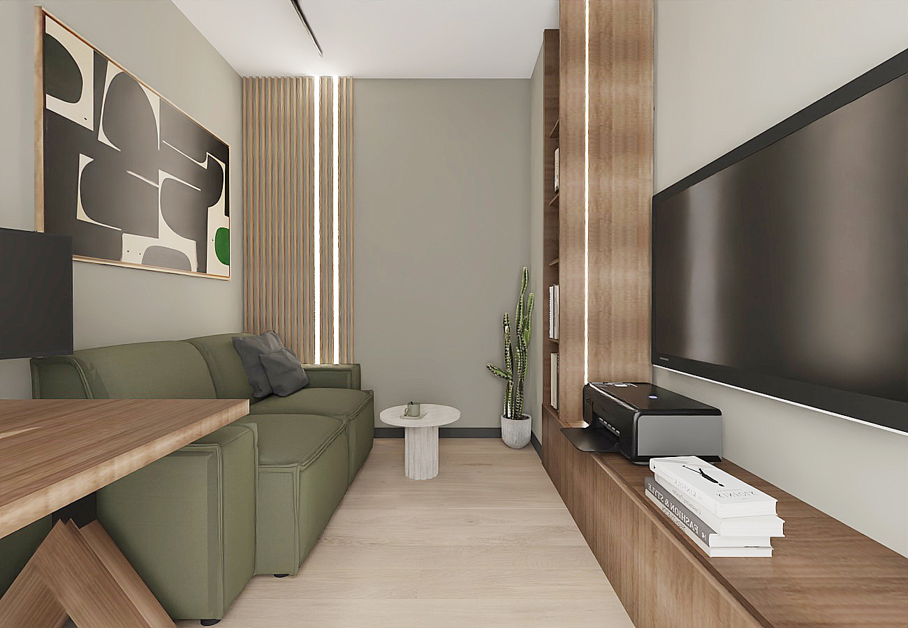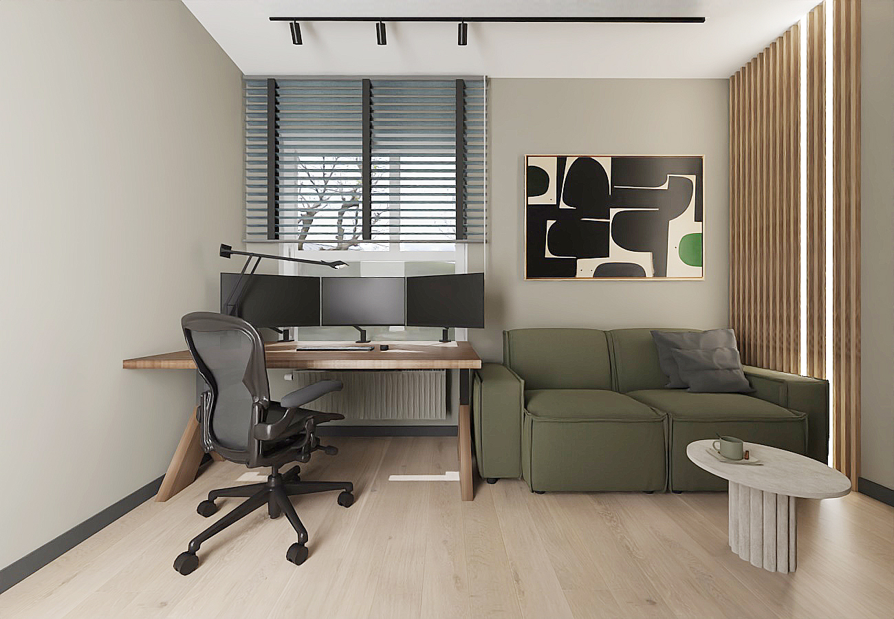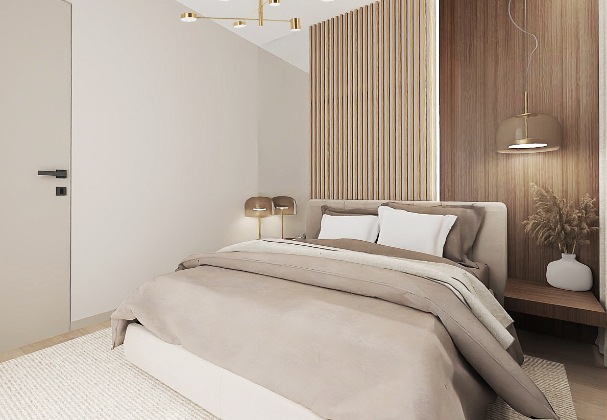 Z salonu prowadzi podłużny korytarz, który pełni funkcję przejściową między poszczególnymi pokojami. Korytarz został zaprojektowany w sposób, który maksymalizuje przestrzeń do przechowywania, co jest kluczowe w małych mieszkaniach. Z jednej strony znajdują się pojemne szafy, które umożliwiają przechowywanie odzieży, butów oraz innych przedmiotów codziennego użytku. W zabudowie również mieści się pralka z suszarką, dzięki czemu w łazience uzyskaliśmy więcej miejsca. Dzięki zabudowie, korytarz pozostaje czysty i uporządkowany, a przestrzeń w mieszkaniu wydaje się bardziej przestronna. Sypialnia w tym 3-pokojowym mieszkaniu to miejsce, które zostało zaprojektowane w ciepłej kolorystyce, sprzyjającej relaksowi i odpoczynkowi po długim dniu pracy. W sypialni znajduje się duże, komfortowe łóżko, które stanowi centralny punkt tej przestrzeni. Za łóżkiem umieszczono panel drewniany z lamelami oraz podłużne lustro, które optycznie powiększa przestrzeń, a jednocześnie wprowadza do sypialni subtelną elegancję. Dodatkowo, w sypialni nie mogło zabraknąć dużej szafy, która zapewnia odpowiednią ilość miejsca do przechowywania odzieży oraz innych przedmiotów osobistych. Dzięki odpowiedniej zabudowie, wnętrze sypialni jest funkcjonalne, ale także bardzo przytulne. Całość utrzymana jest w stonowanej, ciepłej kolorystyce, która wprowadza do wnętrza spokój i harmonię. Właściciele mieszkania pracują zdalnie, dlatego jednym z kluczowych elementów aranżacji była przestrzeń do pracy. Gabinet, który znajduje się w tym mieszkaniu, został zaprojektowany w sposób, który umożliwia komfortową pracę zdalną. Kolorystyka tego pomieszczenia jest nieco ciemniejsza niż w innych częściach mieszkania, co tworzy atmosferę sprzyjającą koncentracji. W gabinecie znajduje się duże biurko, które pomieści trzy monitory, co jest idealnym rozwiązaniem dla osób pracujących na wielu ekranach jednocześnie. W gabinecie znajduje się również wąska sofa z funkcją spania, która stanowi dodatkowe miejsce do odpoczynku, a także zabudowa na dokumenty, drukarkę oraz telewizor. Dzięki takim rozwiązaniom, gabinet staje się w pełni funkcjonalnym miejscem do pracy, które jednocześnie nie traci na estetyce i komforcie. To 3-pokojowe mieszkanie o powierzchni 65 m² na osiedlu Perspektywa w Gdańsku to przykład przemyślanej aranżacji wnętrz, która łączy nowoczesny design z funkcjonalnością. Dzięki starannemu zaplanowaniu przestrzeni, każdy metr kwadratowy mieszkania został wykorzystany w sposób optymalny, co sprawia, że wnętrze jest zarówno wygodne, jak i estetyczne. Jeśli szukasz projektanta wnętrz w Gdańsku, który pomoże Ci stworzyć przestrzeń, która odpowiada Twoim potrzebom, ten projekt jest doskonałym przykładem tego, jak połączyć funkcjonalność z elegancją.