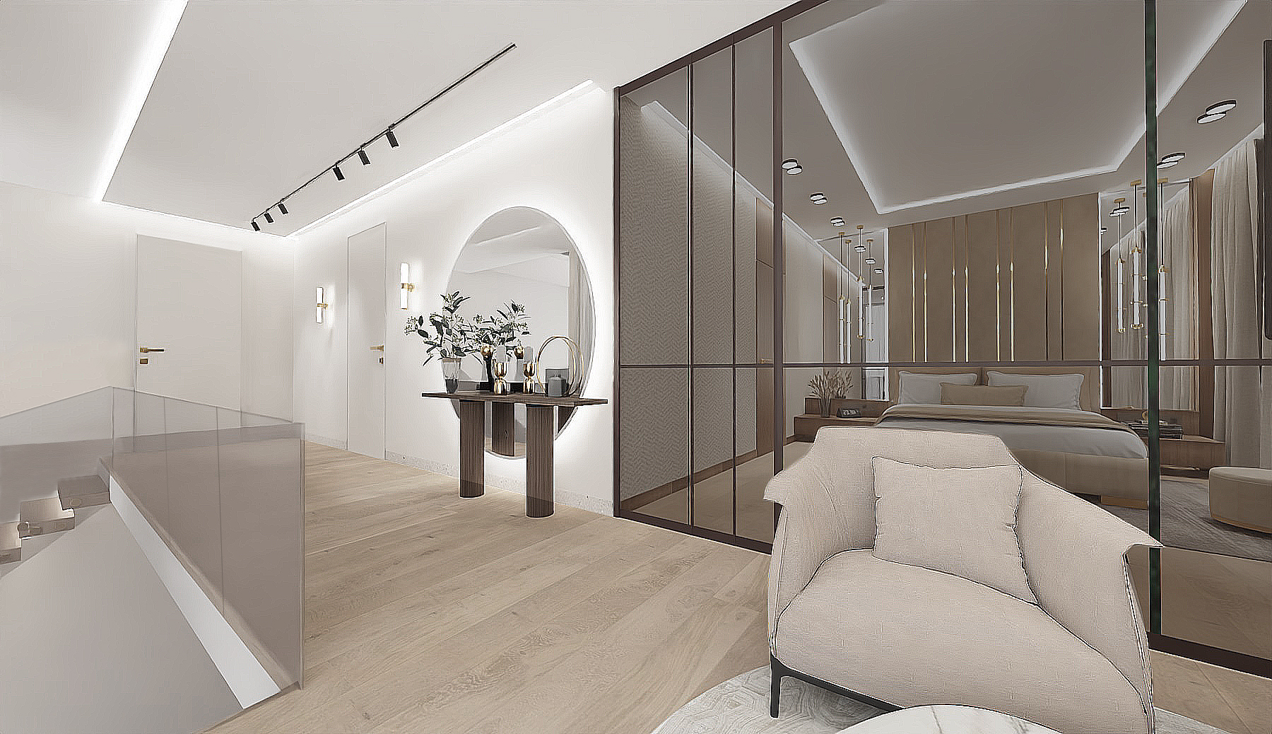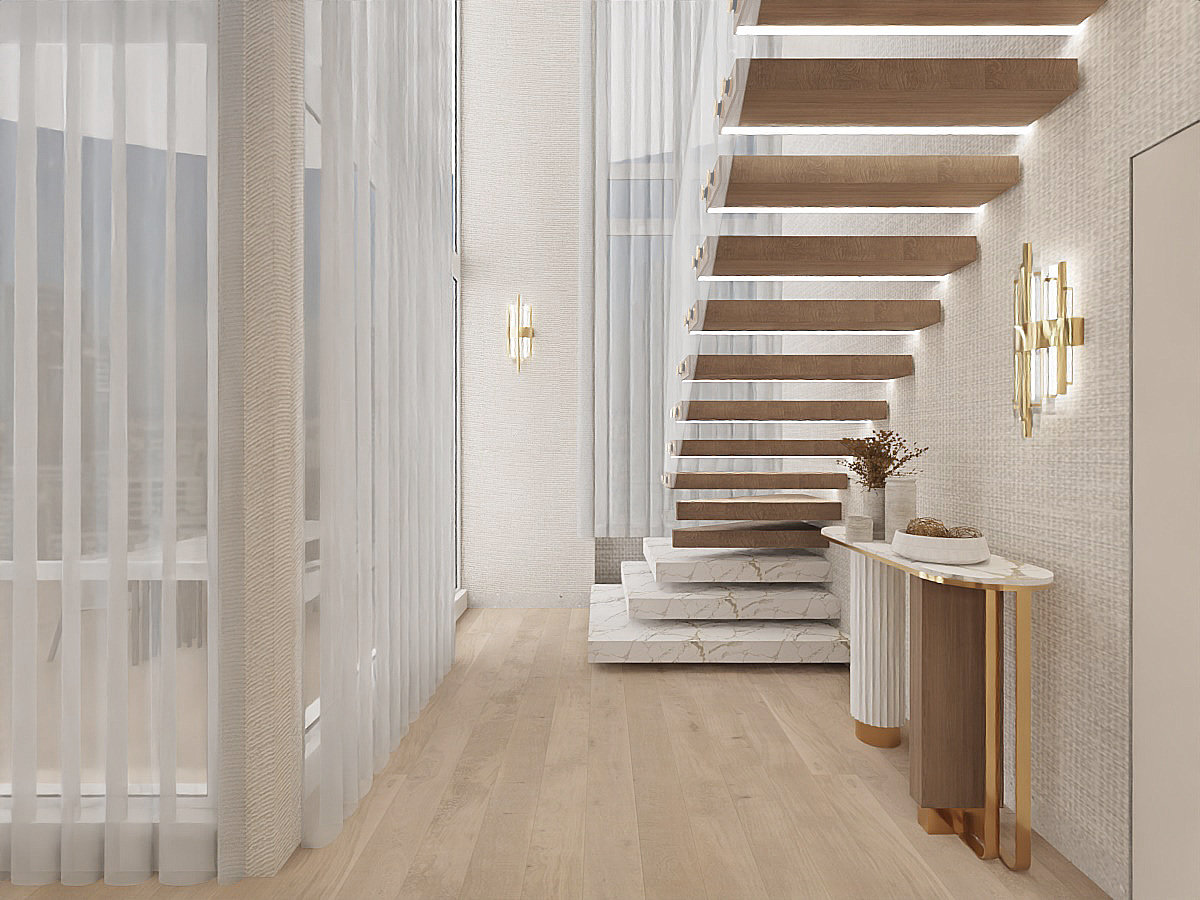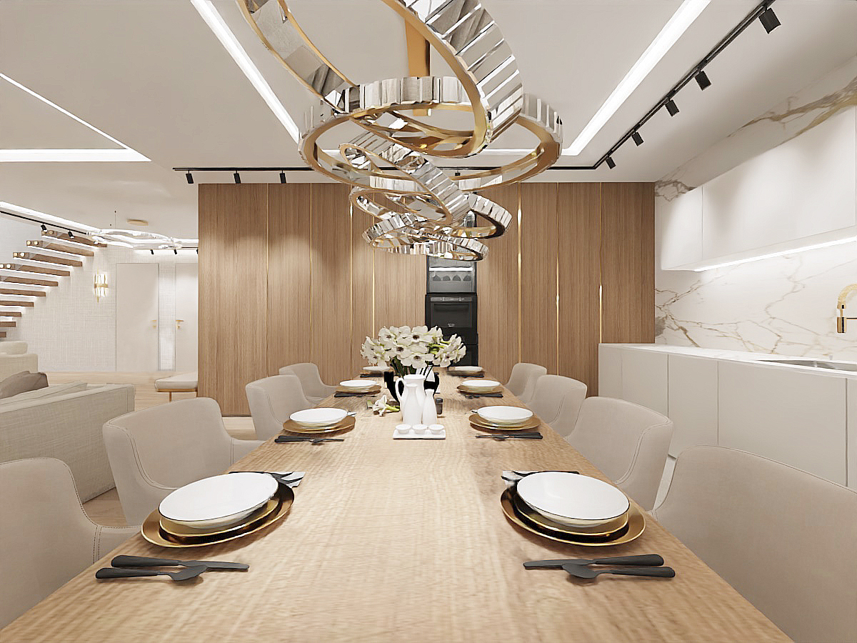 Styl i Kolorystyka – Na pierwszym poziomie apartamentu panuje przytulna, ciepła kolorystyka, która nadaje przestrzeni elegancki i relaksujący charakter. Odcienie ciepłego drewna, beżowe tkaniny oraz złote akcenty w postaci lamp, dodatków i innych detali tworzą spójną całość, która zachwyca od pierwszego wejrzenia. Meble, takie jak beżowa sofa, fotel czy zasłony, zostały dobrane z dbałością o najmniejszy detal, zapewniając jednocześnie funkcjonalność i estetykę. W kuchni centralnym punktem jest duży stół na 12 osób, wokół którego można organizować spotkania, uroczystości rodzinne czy biznesowe. Długi blat roboczy, o długości 5 metrów, zapewnia wygodę podczas gotowania i przygotowywania posiłków, a elegancka wysoka zabudowa w kuchni, z drewnianymi frontami, ukrywa sprzęty AGD, takie jak lodówka, piekarnik czy kawiarka. W zabudowie znalazło się również miejsce na przestronną spiżarnię, zapewniającą dodatkową funkcjonalność. Elegancka Łazienka i Gabinet – Harmonia Wnętrza Na tym poziomie apartamentu znajduje się również przestronna, gościnna łazienka, zaprojektowana w sposób minimalistyczny, z dbałością o każdy detal. Zastosowanie klasycznych, eleganckich materiałów sprawia, że wnętrze łazienki jest nie tylko funkcjonalne, ale i wyjątkowo estetyczne. Na wprost wejścia mieści się lustro na całej wysokości pomieszczenia, które powiększa optycznie to wnętrze a dodatkowo odbijający się kamień tworzy ciekawy, oryginalny wzór odbijając się w lustrze. Gabinet, usytuowany obok holu wejściowego, jest idealnym miejscem do pracy lub spotkań biznesowych. Jego minimalistyczny, ale elegancki wystrój sprawia, że jest to przestrzeń pełna spokoju i komfortu. Z kolei, praktyczna garderoba, zaprojektowana została w taki sposób, by pomieścić wszystkie niezbędne przedmioty, stanowi idealne uzupełnienie tej strefy apartamentu. Ważnym elementem architektonicznym apartamentu są reprezentacyjne schody wspornikowe, które stanowią kluczowy punkt wizualny całej przestrzeni. Stopnie wykonane z drewna oraz spieku o rysunku białego marmuru podkreślają elegancki charakter wnętrza. Schody prowadzą na górny poziom apartamentu, gdzie znajduje się część prywatna. Na drugim poziomie apartamentu znajduje się główna sypialnia, która stanowi prawdziwą oazę spokoju i komfortu. Ciepłe, miękkie tkaniny w odcieniach kaszmirowych oraz tapicerowane wezgłowie łóżka, które jest podzielone złotymi listwami, wprowadza do wnętrza luksusowy akcent. Po bokach łóżka znajdują się wysokie lustra, w których odbijają się delikatne, złote lampy, tworząc subtelną, ale wyrafinowaną atmosferę. Sypialnia oddzielona jest od korytarza przez przeszkloną konstrukcję ze szkła, która nie tylko dodaje wnętrzu lekkości, ale również umożliwia podziwianie panoramicznego widoku na Warszawę, w tym na słynny Pałac Kultury i Nauki. Przestronna łazienka przynależąca do sypialni zachwyca zastosowaniem luksusowych materiałów – połączeniem białego marmuru z brązowymi żyłkami oraz drewna. Duży prysznic, w którym komfortowo zmieszczą się dwie osoby, oraz liczne schowki na niezbędne akcesoria, czynią to wnętrze zarówno estetycznym, jak i praktycznym. Z łazienki bezpośrednio przechodzi się do garderoby, która została zaprojektowana tak, aby pomieścić wszystkie ubrania i buty, gwarantując przy tym porządek i łatwy dostęp do rzeczy. Apartament w pełni odpowiada na potrzeby rodziny. Na tym poziomie znajduje się również sypialnia syna, która została zaprojektowana w stylu minimalistycznym, z użyciem stonowanych barw drewna i szarości. Akcenty w postaci czerwonego dywanu i krzesła ożywiają przestrzeń, nadając jej przyjazny charakter. Drewniana zabudowa wezgłowia łóżka ociepla wnętrze, a oryginalna forma łuku dodaje pomieszczeniu unikalnego charakteru. Jednym z największych atutów tego apartamentu jest przestronny taras, który stanowi idealne miejsce do relaksu na świeżym powietrzu. Z tarasu rozpościera się wspaniały widok na panoramę Warszawy, a w chłodniejsze dni, dzięki zamontowanym promiennikom tarasowym, przestrzeń staje się w pełni funkcjonalna. Na tarasie znajduje się strefa jadalna z dużym stołem oraz wygodny kącik wypoczynkowy, który sprzyja relaksowi. Podsumowanie – ten dwupoziomowy apartament w centrum Warszawy to połączenie elegancji, nowoczesności oraz komfortu. Zaprojektowany z dbałością o każdy detal, zachwyca przestronnością oraz funkcjonalnością, oferując jednocześnie luksusowy wystrój wnętrz. Zastosowanie ekskluzywnych materiałów, takich jak drewno, marmur, szkło oraz wysokiej jakości tkaniny, w połączeniu z nowoczesnymi rozwiązaniami architektonicznymi, sprawia, że jest to przestrzeń idealna dla osób, które cenią wyjątkowy design oraz komfort życia w stolicy.