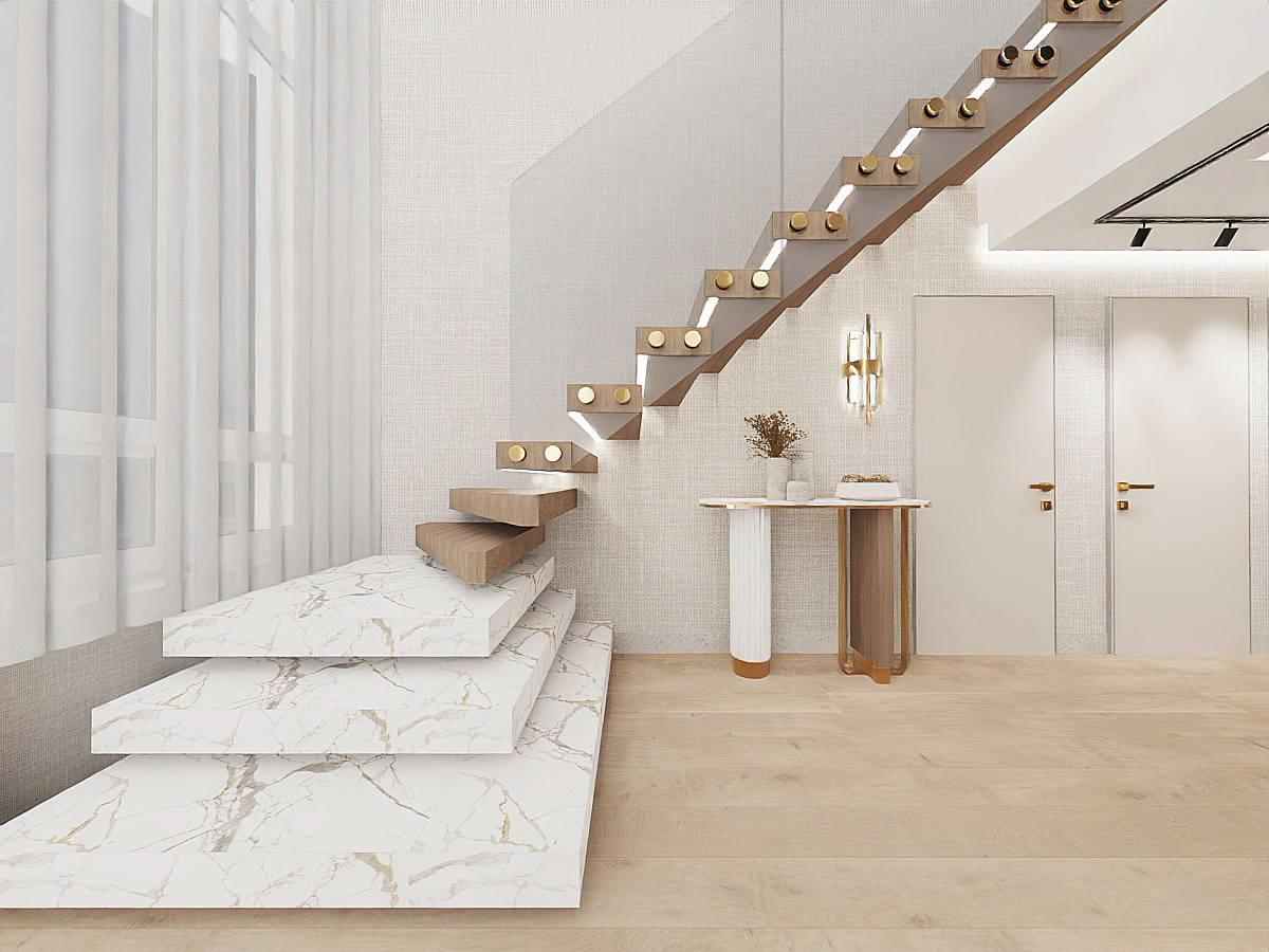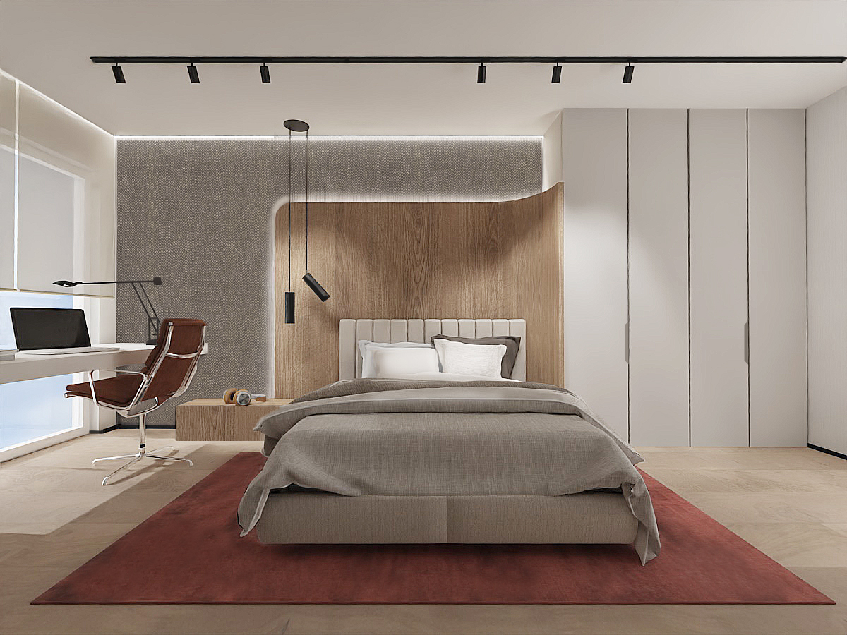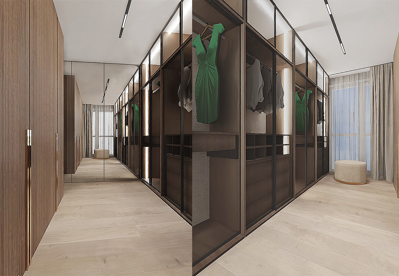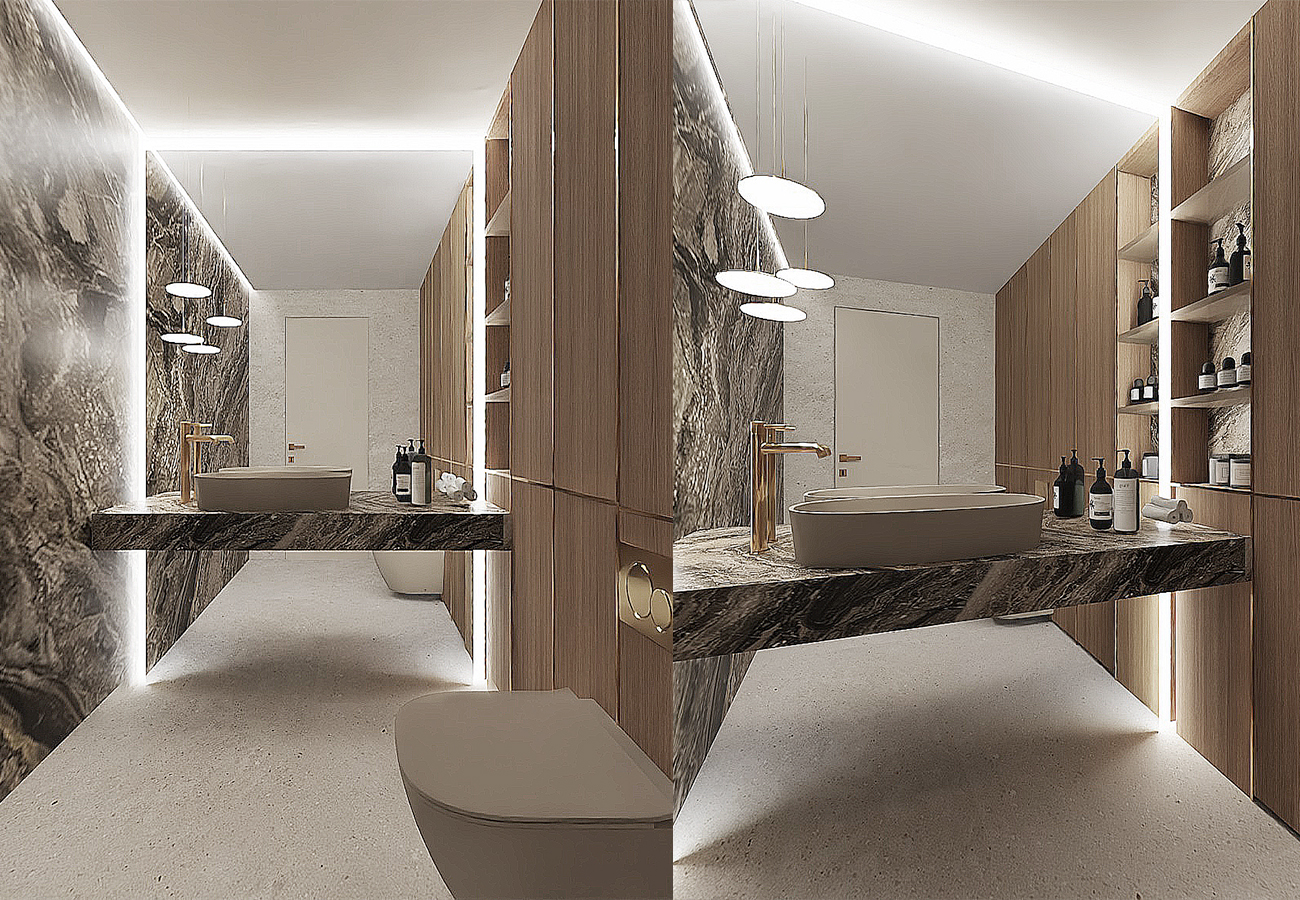 Styl i Kolorystyka – Na pierwszym poziomie apartamentu panuje przytulna, ciepła kolorystyka, która nadaje przestrzeni elegancki i relaksujący charakter. Odcienie ciepłego drewna, beżowe tkaniny oraz złote akcenty w postaci lamp, dodatków i innych detali tworzą spójną całość, która zachwyca od pierwszego wejrzenia. Meble, takie jak beżowa sofa, fotel czy zasłony, zostały dobrane z dbałością o najmniejszy detal, zapewniając jednocześnie funkcjonalność i estetykę. W kuchni centralnym punktem jest duży stół na 12 osób, wokół którego można organizować spotkania, uroczystości rodzinne czy biznesowe. Długi blat roboczy, o długości 5 metrów, zapewnia wygodę podczas gotowania i przygotowywania posiłków, a elegancka wysoka zabudowa w kuchni, z drewnianymi frontami, ukrywa sprzęty AGD, takie jak lodówka, piekarnik czy kawiarka. W zabudowie znalazło się również miejsce na przestronną spiżarnię, zapewniającą dodatkową funkcjonalność. Elegancka Łazienka i Gabinet – Harmonia Wnętrza Na tym poziomie apartamentu znajduje się również przestronna, gościnna łazienka, zaprojektowana w sposób minimalistyczny, z dbałością o każdy detal. Zastosowanie klasycznych, eleganckich materiałów sprawia, że wnętrze łazienki jest nie tylko funkcjonalne, ale i wyjątkowo estetyczne. Na wprost wejścia mieści się lustro na całej wysokości pomieszczenia, które powiększa optycznie to wnętrze a dodatkowo odbijający się kamień tworzy ciekawy, oryginalny wzór odbijając się w lustrze. Gabinet, usytuowany obok holu wejściowego, jest idealnym miejscem do pracy lub spotkań biznesowych. Jego minimalistyczny, ale elegancki wystrój sprawia, że jest to przestrzeń pełna spokoju i komfortu. Z kolei, praktyczna garderoba, zaprojektowana została w taki sposób, by pomieścić wszystkie niezbędne przedmioty, stanowi idealne uzupełnienie tej strefy apartamentu. Ważnym elementem architektonicznym apartamentu są reprezentacyjne schody wspornikowe, które stanowią kluczowy punkt wizualny całej przestrzeni. Stopnie wykonane z drewna oraz spieku o rysunku białego marmuru podkreślają elegancki charakter wnętrza. Schody prowadzą na górny poziom apartamentu, gdzie znajduje się część prywatna. Na drugim poziomie apartamentu znajduje się główna sypialnia, która stanowi prawdziwą oazę spokoju i komfortu. Ciepłe, miękkie tkaniny w odcieniach kaszmirowych oraz tapicerowane wezgłowie łóżka, które jest podzielone złotymi listwami, wprowadza do wnętrza luksusowy akcent. Po bokach łóżka znajdują się wysokie lustra, w których odbijają się delikatne, złote lampy, tworząc subtelną, ale wyrafinowaną atmosferę. Sypialnia oddzielona jest od korytarza przez przeszkloną konstrukcję ze szkła, która nie tylko dodaje wnętrzu lekkości, ale również umożliwia podziwianie panoramicznego widoku na Warszawę, w tym na słynny Pałac Kultury i Nauki. Przestronna łazienka przynależąca do sypialni zachwyca zastosowaniem luksusowych materiałów – połączeniem białego marmuru z brązowymi żyłkami oraz drewna. Duży prysznic, w którym komfortowo zmieszczą się dwie osoby, oraz liczne schowki na niezbędne akcesoria, czynią to wnętrze zarówno estetycznym, jak i praktycznym. Z łazienki bezpośrednio przechodzi się do garderoby, która została zaprojektowana tak, aby pomieścić wszystkie ubrania i buty, gwarantując przy tym porządek i łatwy dostęp do rzeczy. Apartament w pełni odpowiada na potrzeby rodziny. Na tym poziomie znajduje się również sypialnia syna, która została zaprojektowana w stylu minimalistycznym, z użyciem stonowanych barw drewna i szarości. Akcenty w postaci czerwonego dywanu i krzesła ożywiają przestrzeń, nadając jej przyjazny charakter. Drewniana zabudowa wezgłowia łóżka ociepla wnętrze, a oryginalna forma łuku dodaje pomieszczeniu unikalnego charakteru. Jednym z największych atutów tego apartamentu jest przestronny taras, który stanowi idealne miejsce do relaksu na świeżym powietrzu. Z tarasu rozpościera się wspaniały widok na panoramę Warszawy, a w chłodniejsze dni, dzięki zamontowanym promiennikom tarasowym, przestrzeń staje się w pełni funkcjonalna. Na tarasie znajduje się strefa jadalna z dużym stołem oraz wygodny kącik wypoczynkowy, który sprzyja relaksowi. Podsumowanie – ten dwupoziomowy apartament w centrum Warszawy to połączenie elegancji, nowoczesności oraz komfortu. Zaprojektowany z dbałością o każdy detal, zachwyca przestronnością oraz funkcjonalnością, oferując jednocześnie luksusowy wystrój wnętrz. Zastosowanie ekskluzywnych materiałów, takich jak drewno, marmur, szkło oraz wysokiej jakości tkaniny, w połączeniu z nowoczesnymi rozwiązaniami architektonicznymi, sprawia, że jest to przestrzeń idealna dla osób, które cenią wyjątkowy design oraz komfort życia w stolicy.